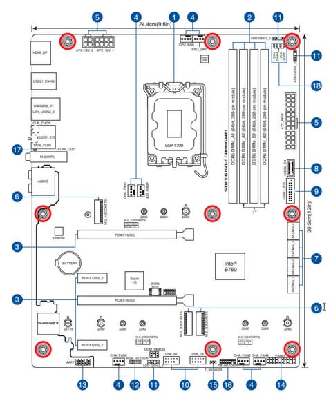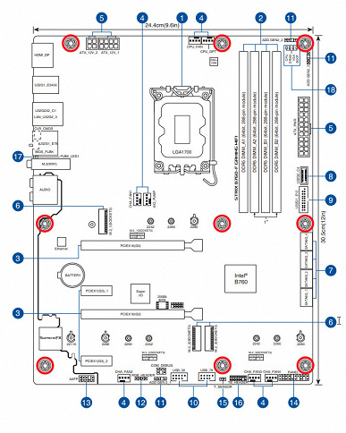 Форм-фактор Mini-ITX имеет размеры 170x170 мм, Micro-ATX до 244×244 мм, ATX до 305×244 мм, а E-ATX — до 305×330 мм. Материнская плата Asus ROG Strix B760-F Gaming WiFi выполнена в форм-факторе ATX, имеет размеры 305×244 мм, и на ней имеются 9 монтажных отверстий для установки в корпус.