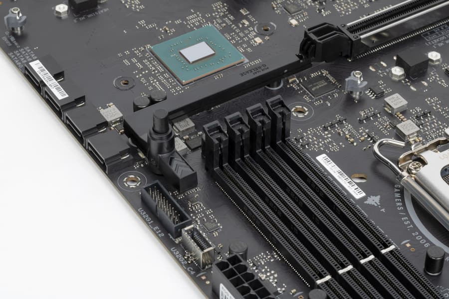 Слоты DIMM не имеют металлической окантовки, защищающую их как от физических повреждений, как и от помех. При этом перемычки на слотах памяти, являющиеся своего рода предохранителями от неверной ориентации модулей памяти, оснащены металлическим покрытием для большей долговечности слотов.