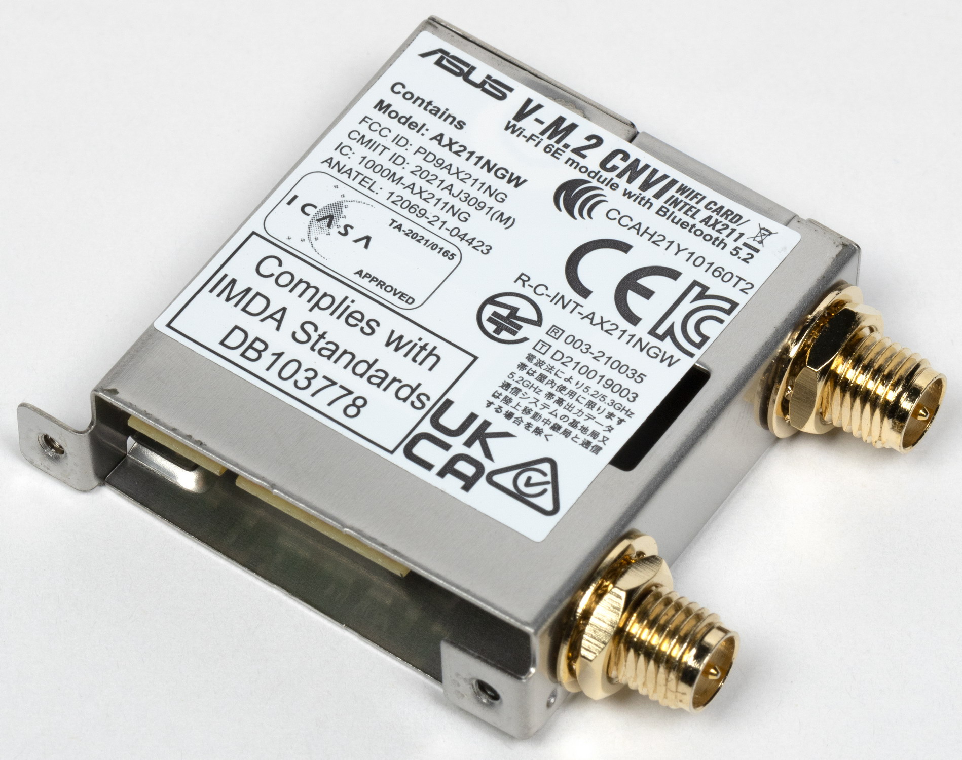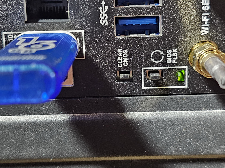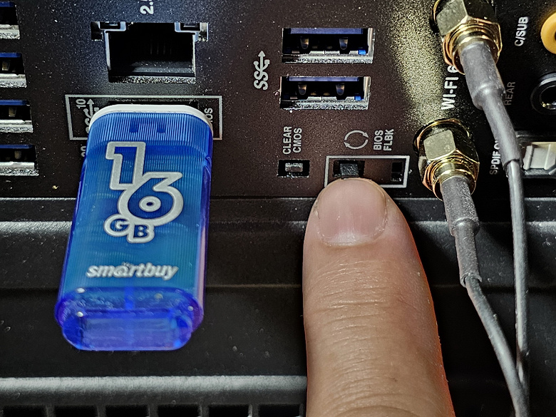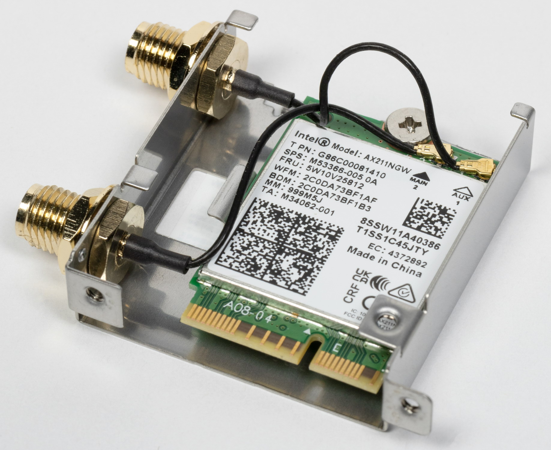 Имеется и комплексный беспроводной адаптер на контроллере Intel AX-211NGW, через который реализованы Wi-Fi 6 (802.11a/b/g/n/ac/ax) и Bluetooth 5.2. Он установлен в слот M.2 (E-key), и его разъемы для привинчивания выносных антенн выведены на заднюю панель.