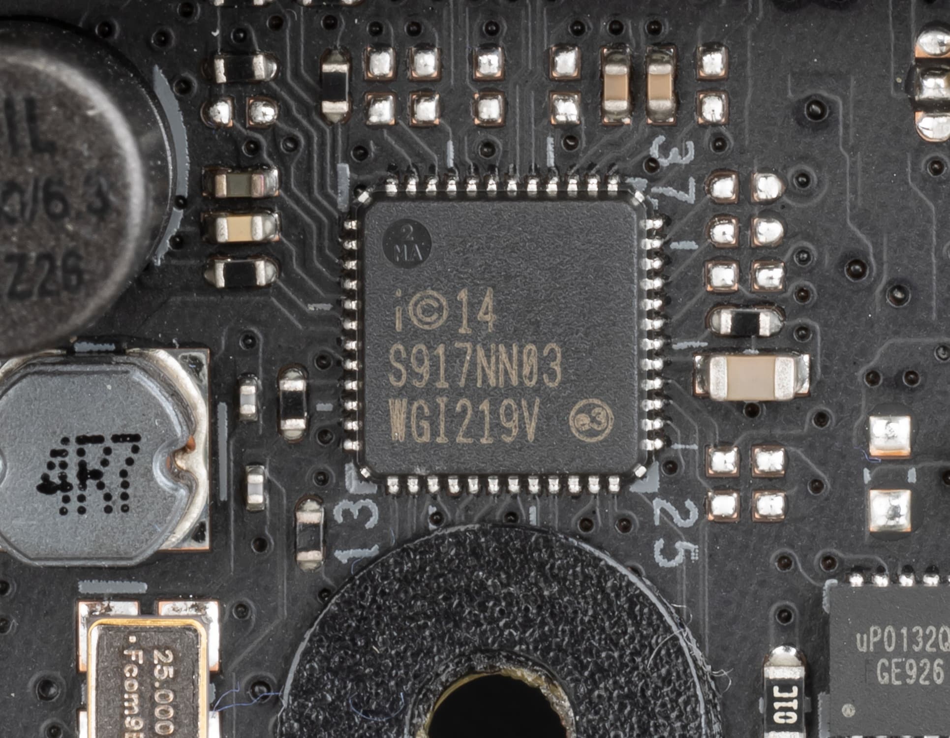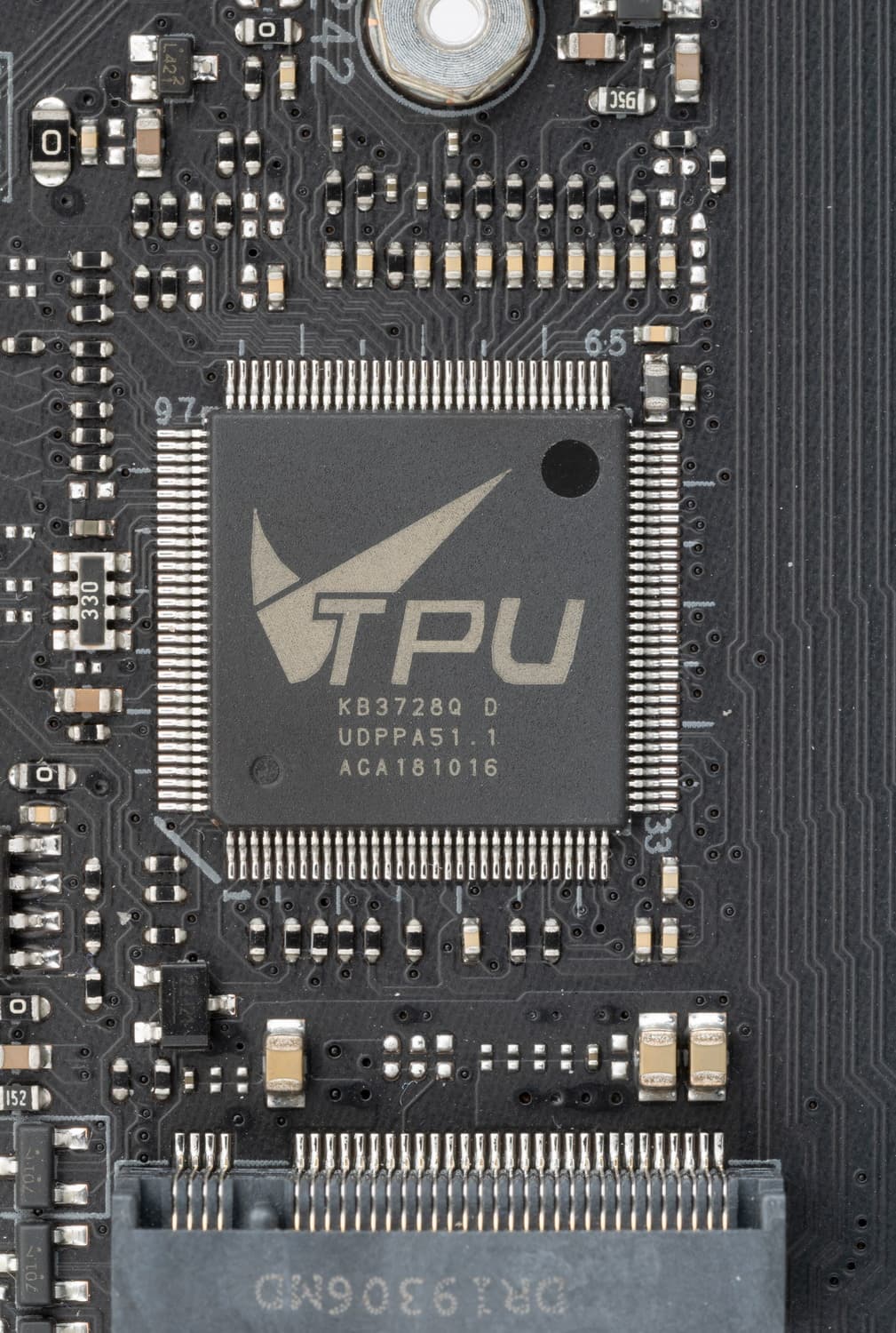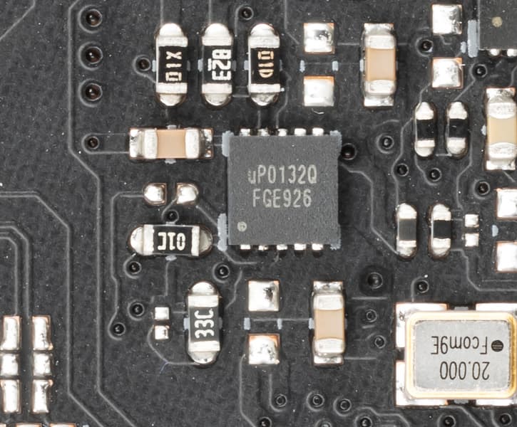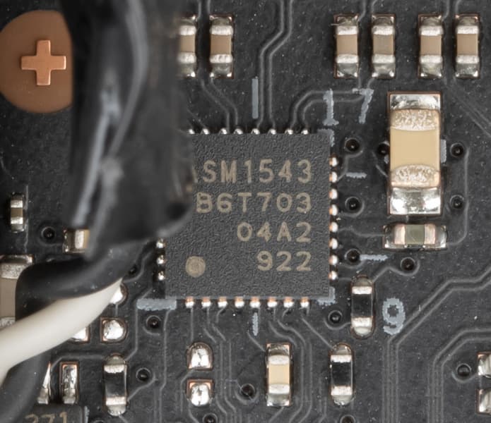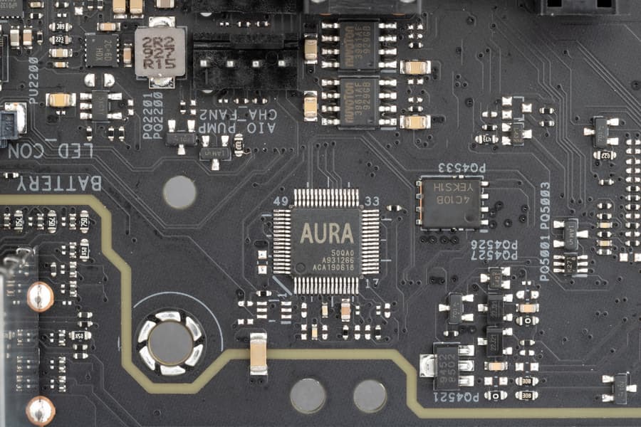 Контроль по синхронизации работы подсветки RGB возложен на чип Aura 50QА0 (неизвестно, как оригинально назывался чип и кто его производитель). Он расположился около аудиотракта.