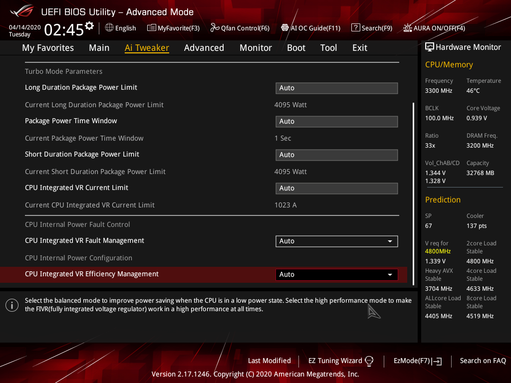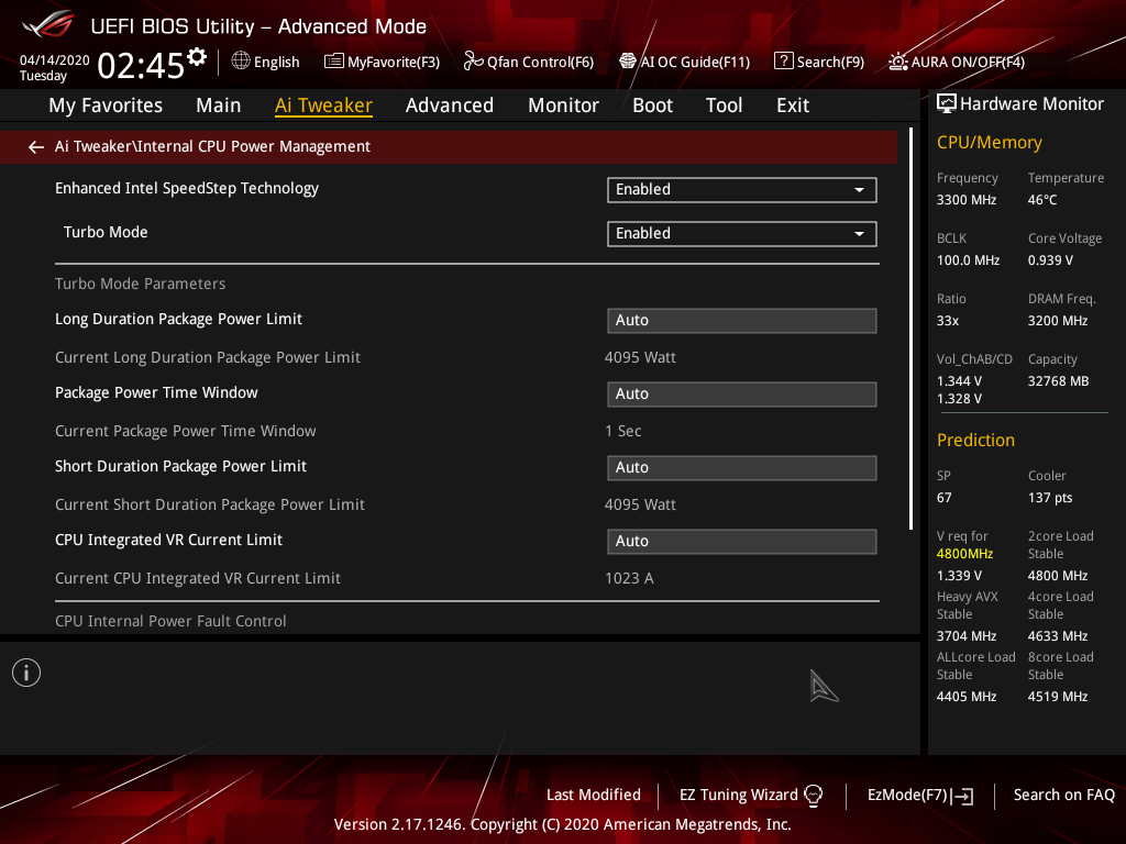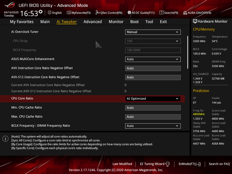 О-пппа! Что ж мы видим? 4,1 ГГц по всем ядрам! Я не менял ничего, оверклокинг никакой не включал! «Умная» система Asus (через TPU и прочие «пимпочки»), не выходя из Windows, поменяла установки, и теперь CPU работает уже на приличном разгоне! И максимум температуры процессора вырос до 79 °C, при этом тепловые показатели на VRM и чипсете почти не изменились. Энергопотребление CPU резко выросло до 203 Вт (против нормативного TDP 165 Вт). Тем не менее, параметры работы CPU и системы в целом в пределах нормы. Стабильность в порядке! Остался лишь вопрос: в данном случае на такой разгон вышел сам бенчмарк, воспользовавшись родственными связями и коррупцией, чтобы от TPU получить подъем частот и вольтажей. А если мы вручную выставим 4,1 ГГц ? ОК, это мы всегда успеем. Вначале проверим саму «умную» систему автооверклокинга (AI Overclocking — Automatic Intelligent Overclocking). Она заложена прямо в BIOS (в «простом» меню — справа сверху), а также можно через AI-Suite включить AI Optimized (обратите внимание на то, что вручную в данном пункте меню AI Optimized не выставить!)