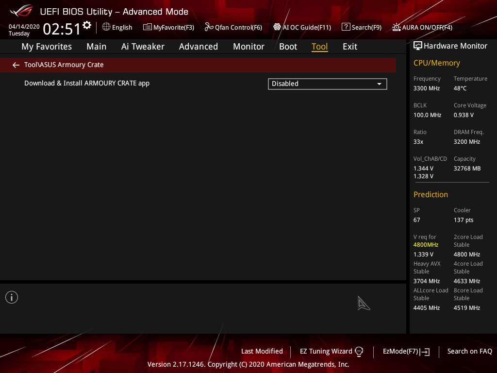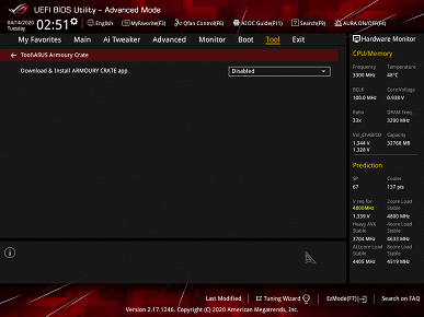 Следует еще сказать про утилиту Armoury Crate, которая является этаким менеджером-надзирателем за всем ПО Asus, следя за своевременным обновлением, управляет подсветкой (Aura Sync ныне интегрирована в Armoury Crate) ну и новыми возможностями, а также отвечает за синхронизацию работы всех устройств Asus под брендом ROG. Ее установщик находится в UEFI BIOS. По умолчанию настройка установки этой программы включена, поэтому не стоит удивляться, если после загрузки Windows вам будет задан вопрос о том — хотите вы установить Armoury Crate или нет. Пока в UEFI включена опция установки Armoury Crate — Asus Live Update будет принудительно установлен, и периодически будет оповещать о надобности обновлений. Удалить его невозможно, т. к. при следующей перезагрузке программа снова будет установлена из UEFI. Так что, если кому сие не нужно — не забудьте в настройках BIOS выключить эту утилиту.