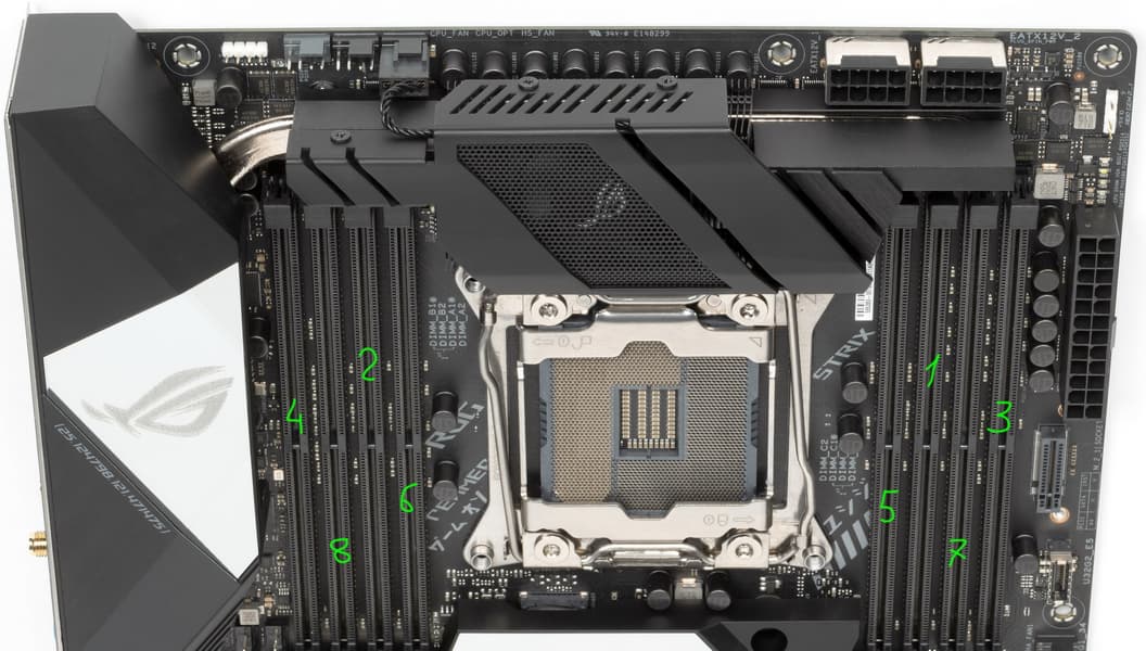 Для установки модулей памяти на плате Asus имеется восемь DIMM-слотов (для работы памяти в Quad Channel в случае использования всего 4 модулей их следует устанавливать в А2, B2, C2 и D2. Плата поддерживает небуферизованную память DDR4 (non-EСС), а максимальный объем памяти составляет: 256 ГБ при использовании UDIMM последнего поколения по 32 ГБ совместно с процессорами Core i9 10000X/9000Х; 128 ГБ в остальных случаях. Поддерживаются профили XMP.