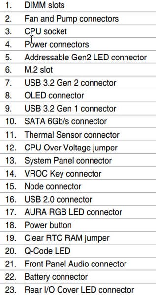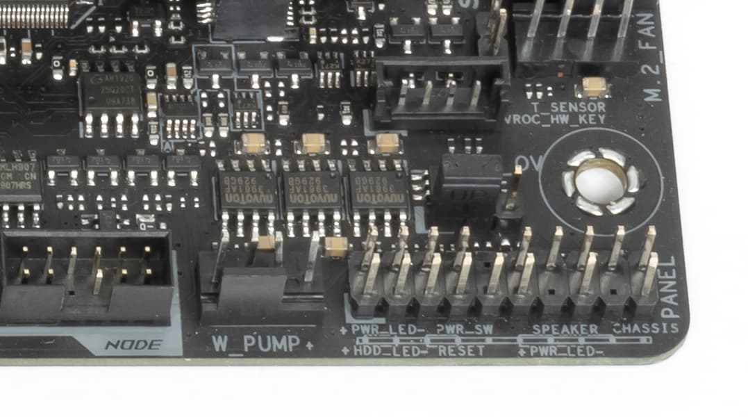 | Прочие внутренние элементы | 24-контактный разъем питания ATX 2 8-контактных разъема питания EPS12V 1 слот M.2 (E-key), занят адаптером беспроводных сетей 1 разъем для подключения порта USB 3.2 Gen2 Type-C 2 разъема для подключения 4 портов USB 3.2 Gen1 2 разъема для подключения 4 портов USB 2.0 8 разъемов для подключения 4-контактных вентиляторов (поддержка помп ЖСО) 2 разъема для подключения неадресуемой RGB-ленты 2 разъема для подключения адресуемой ARGB-ленты 1 разъем аудио для передней панели корпуса 1 разъем NODE 2 разъема для подключения управления с передней панели корпуса 1 разъем сброса CMOS 1 разъем CPU Over Voltage 1 кнопка включения питания Power 1 разъем для термодатчика 1 разъем VROC |