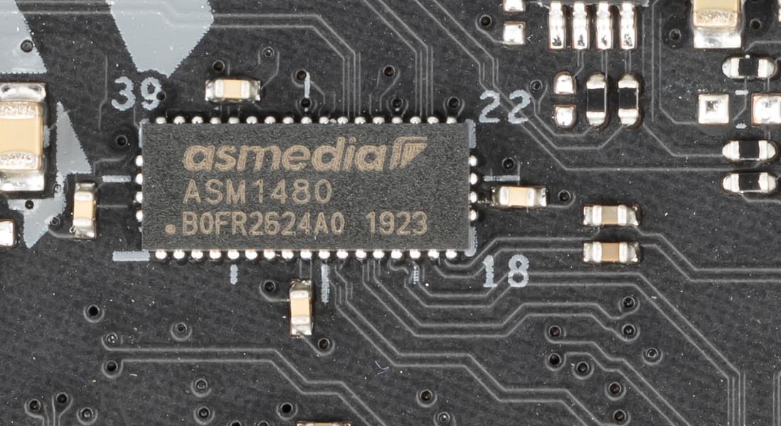 У данной платы распределение линий PCIe между слотами в случае использования более одной видеокарты для разных процессоров, — достаточно простое, поэтому мультиплексоры ASM1480 от ASMedia востребованы в малом количестве.
