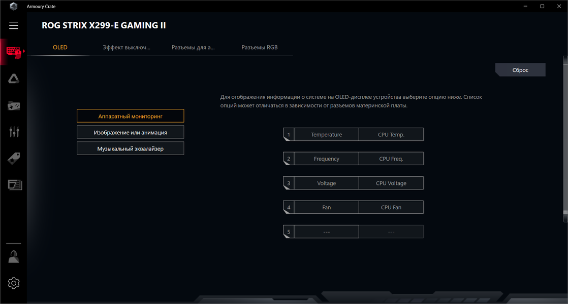 Топовые платы ROG всегда имеют красивую подсветку с особым дизайном (см. видеоролик выше): светодиоды образуют яркие эффекты на кожухе, покрывающем задний блок с разъемами, а также бывают подсвечены радиатор чипсета и иногда кожух над блоком аудио. В данном случае подсветка имеется только на основном кожухе. Плюс имеется OLED экранчик (о нем упоминал уже ранее, а его настройки будут рассмотрены ниже). Так же мы помним про 4 разъема для подключения внешней подсветки, и всем этим можно управлять через программу Armoury Crate.