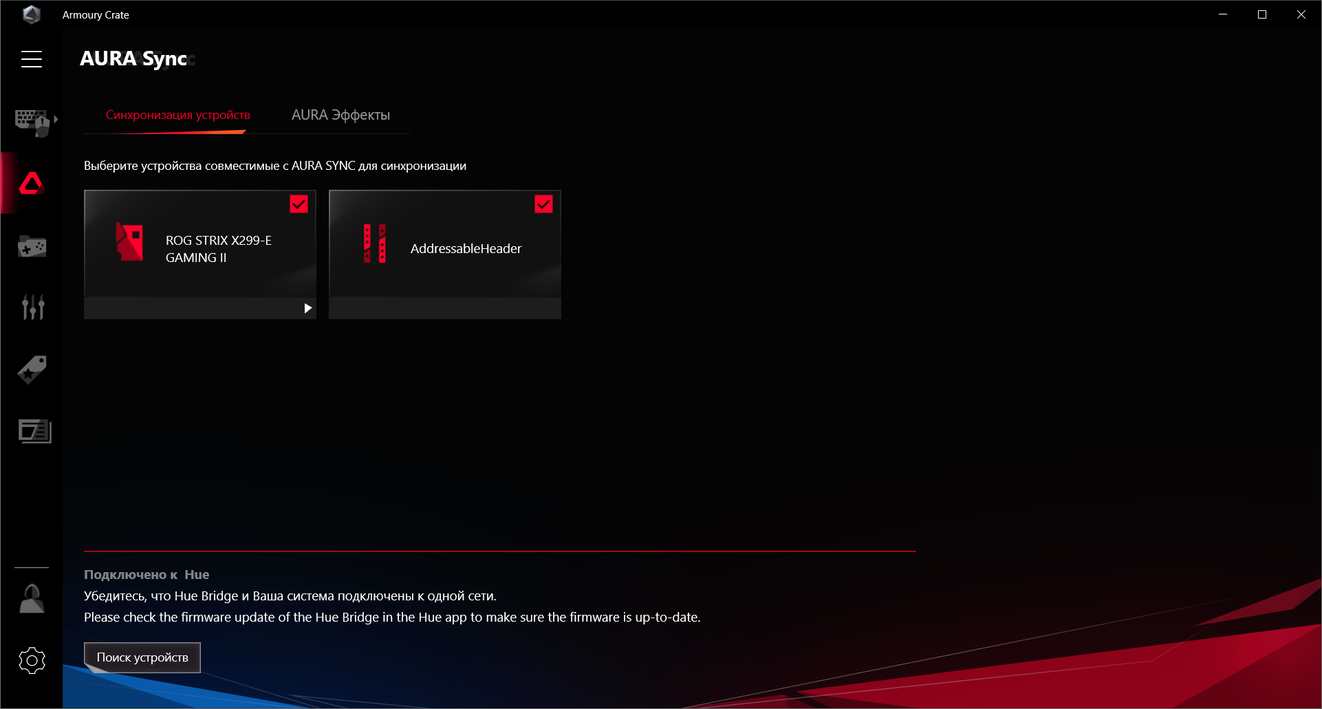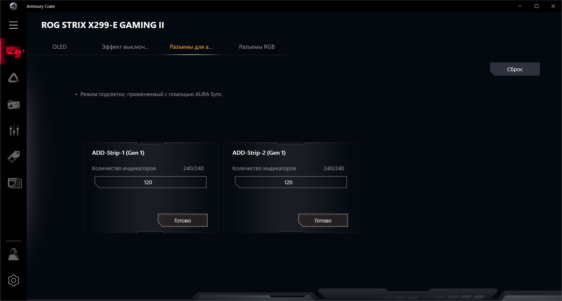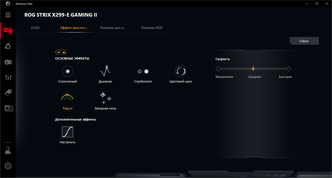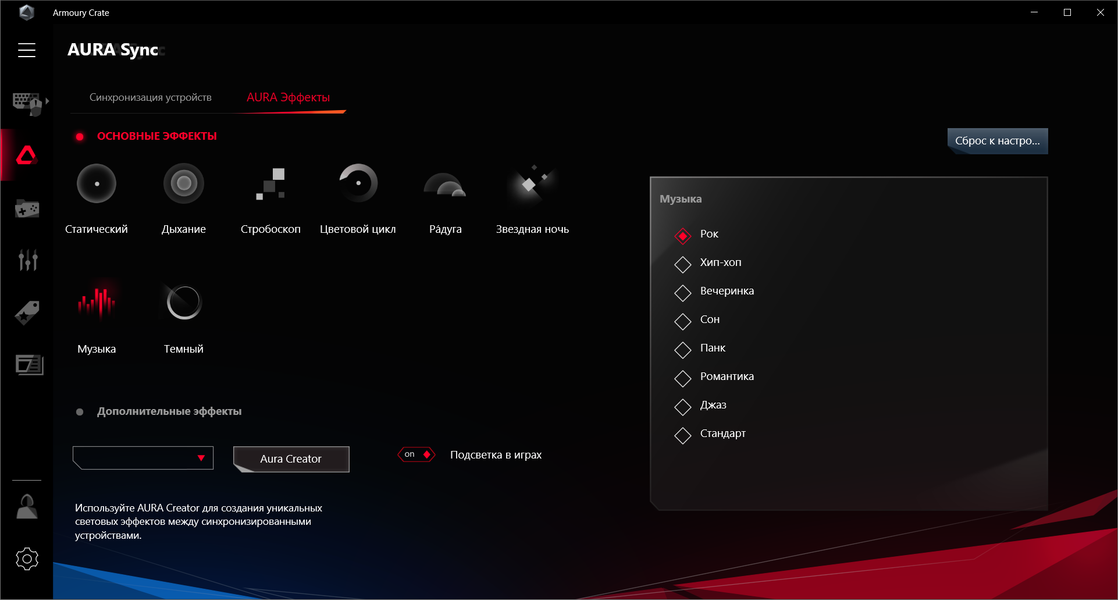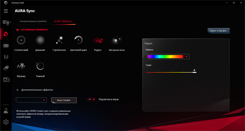 Управление подсветкой теперь тоже внутри Armoury Crate. Можно настроить эффекты подсветки при выключенной материнской плате (когда ПК выключен, но БП все равно подает питание на материнскую плату).