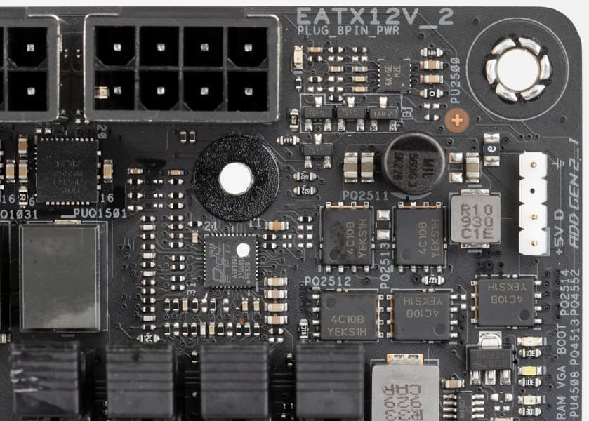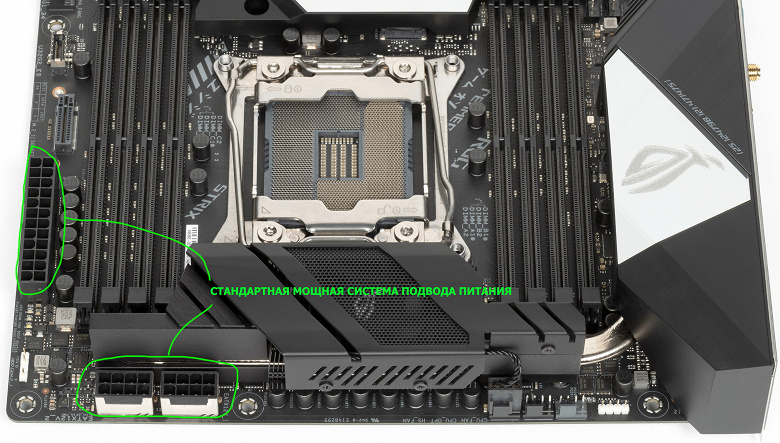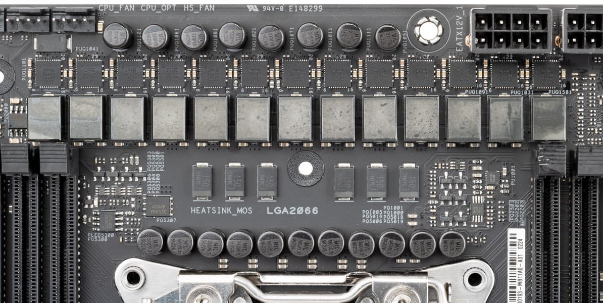 Блок питания Unicore расположен под сокетом LGA 2066 и имеет 1-фазную схему питания.