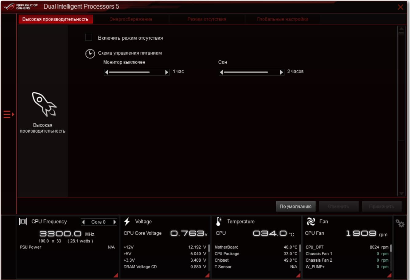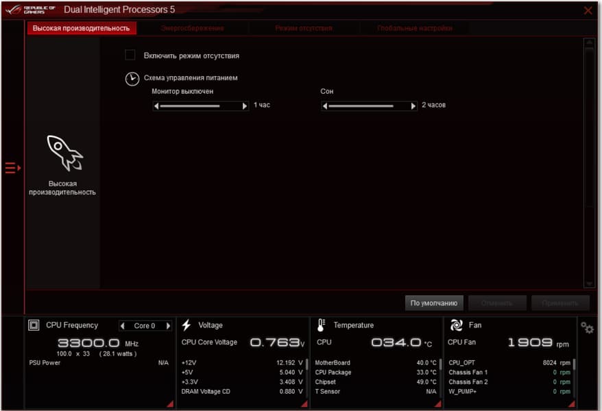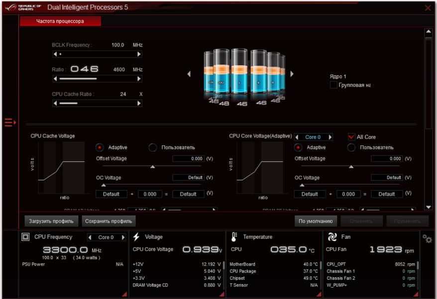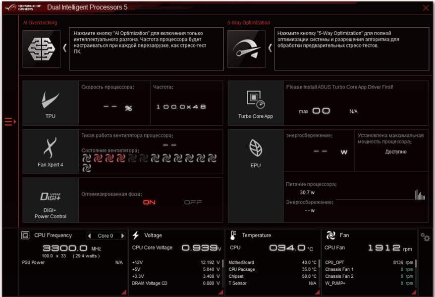 Основная программа — AI-Suite. В ней все управление параметрами работы материнской платы, и основным элементом является Dual Intelligent Processors 5 — программа настройки работы всей платы по частотам, вентиляторам и напряжениям.