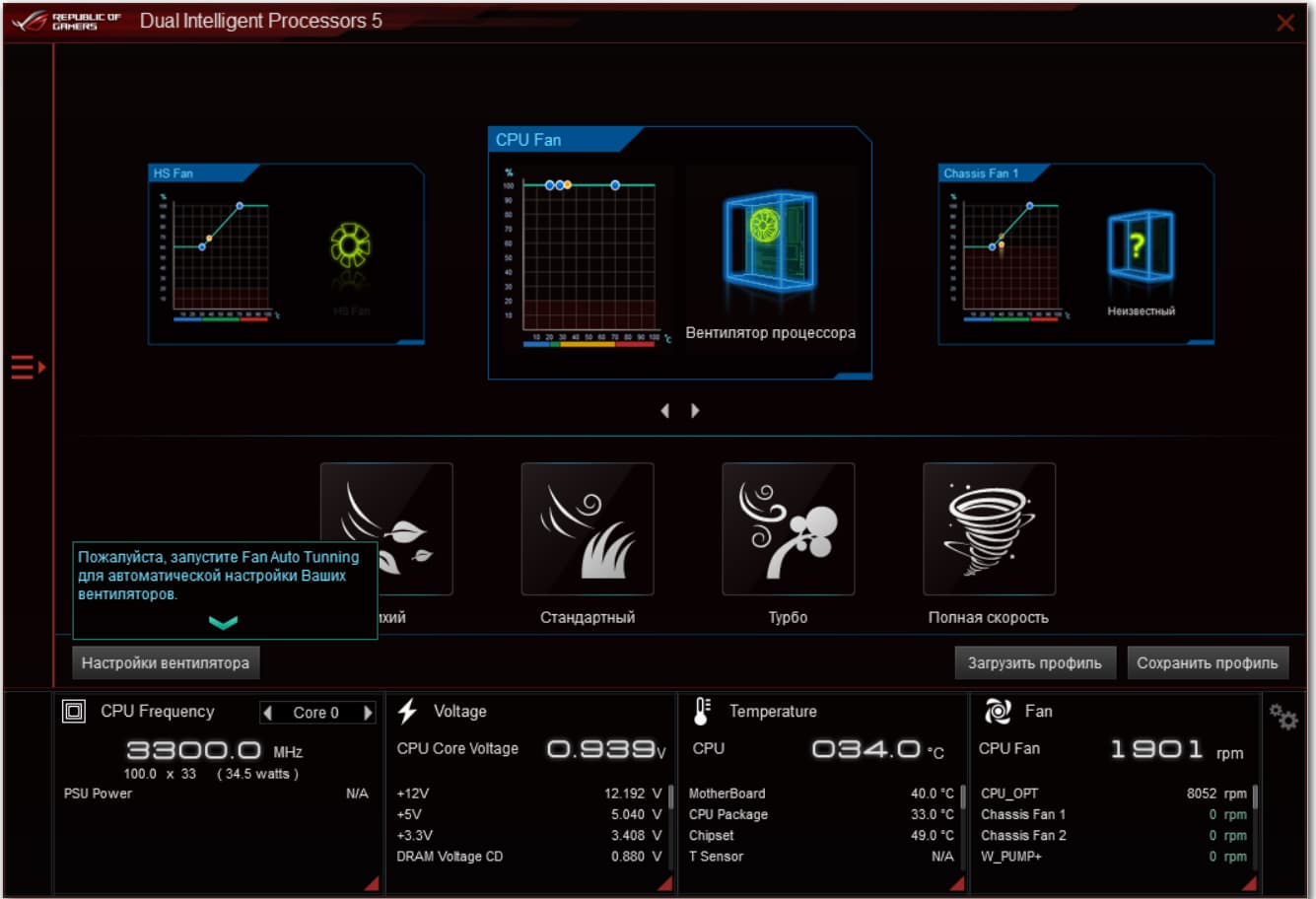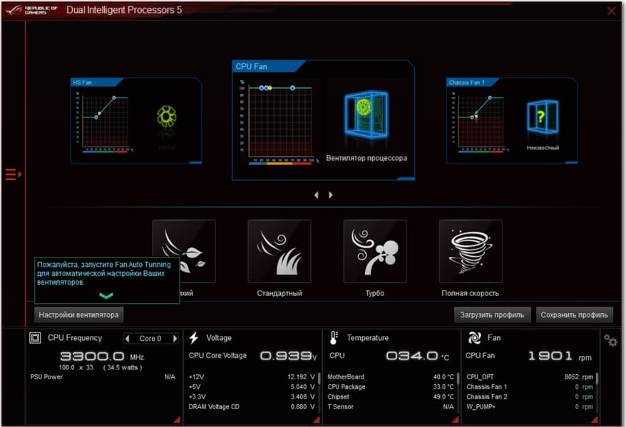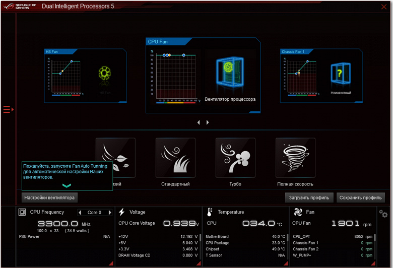 Да, настройки работы вентиляторов — очень наглядны и удобны. Кстати, не стоит забывать, что при включении материнская плата тестирует все подключенные к ней вентиляторы, и потому не надо удивляться, если увидите, что системный блок чуть приподнялся и издает вой.. Это на пару секунд всего. Потом вышеупомянутый Q-Fan вступит в силу, и вентиляторы заработают так, как вы установили.