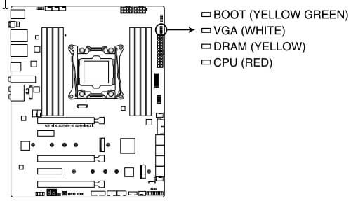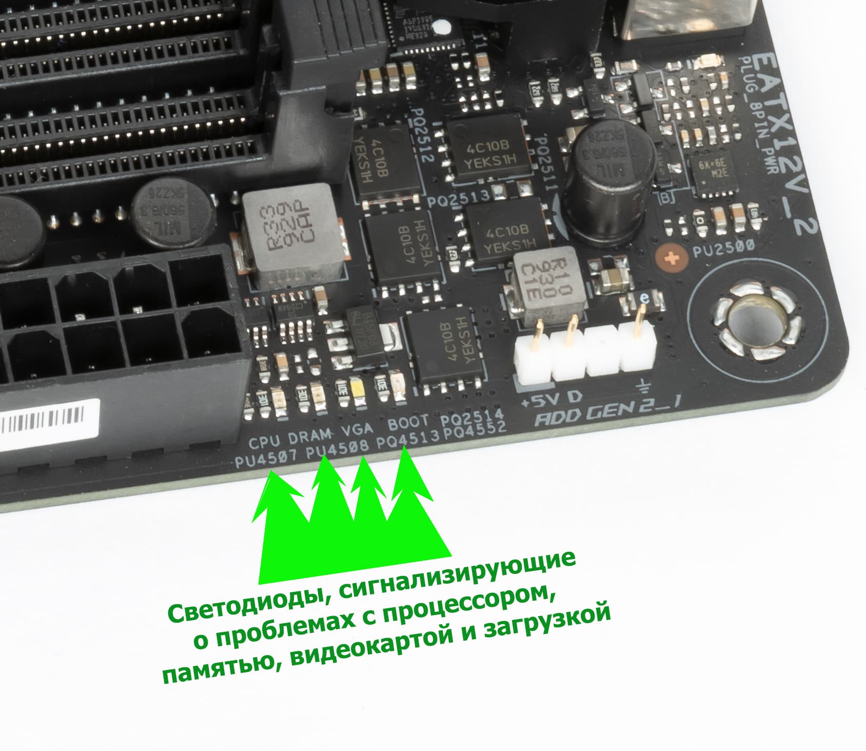У платы еще есть световые индикаторы, сообщающие о проблемах с тем или иным компонентом системы.