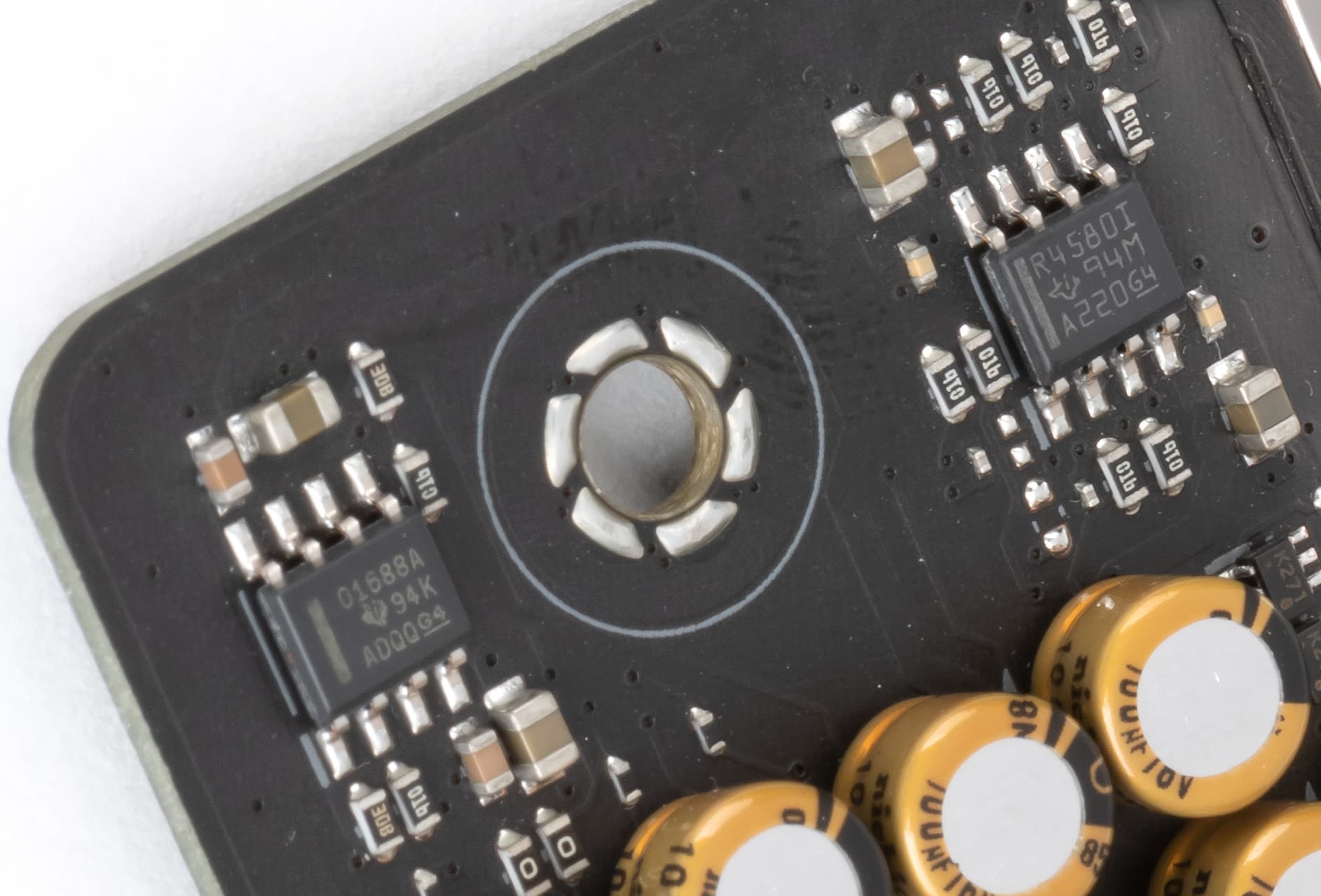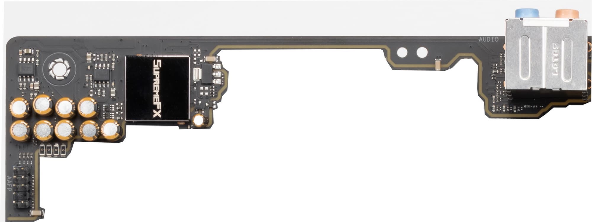 Аудиотракт вынесен на угловую часть платы, не пересекается с другими элементами. Разумеется, левый и правый каналы разведены по разным слоям печатной платы. Все аудиоразъемы на задней панели имеют позолоченное покрытие.