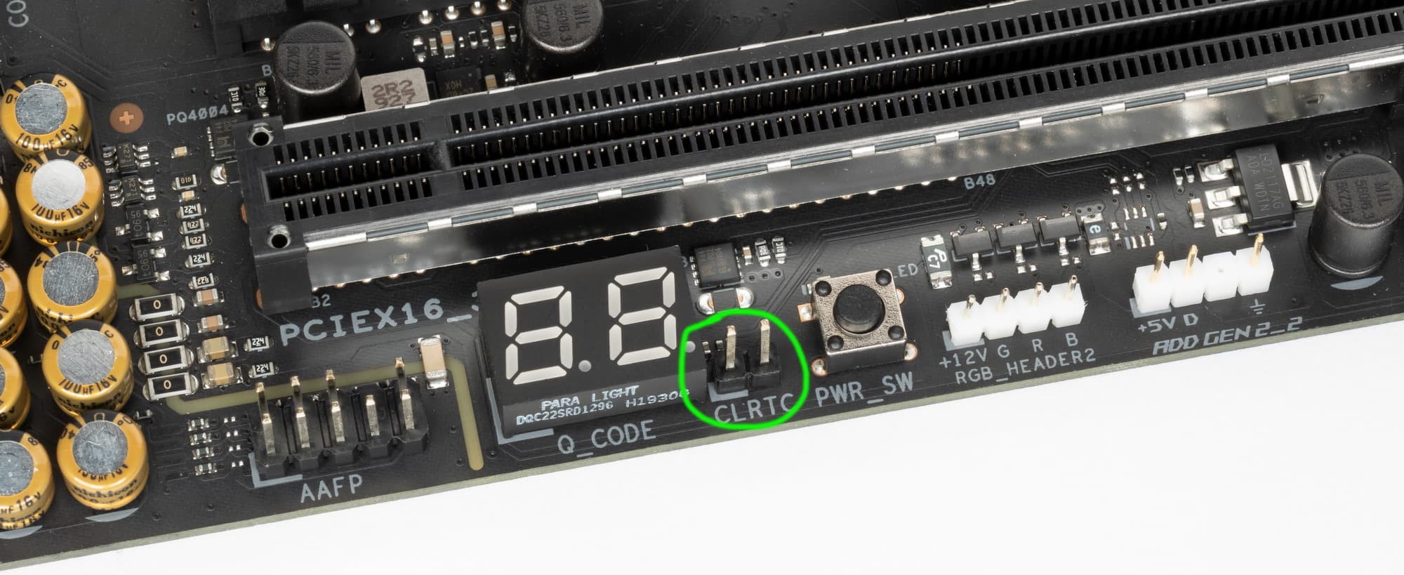Рядом с кнопкой питания есть перемычка, отвечающая за сброс настроек CMOS (BIOS). Ну вот это еще одно маленькое свидетельство того, что плата не относится к флагманским: у тех функция сброса CMOS, как правило, возложено на кнопку на задней панели.