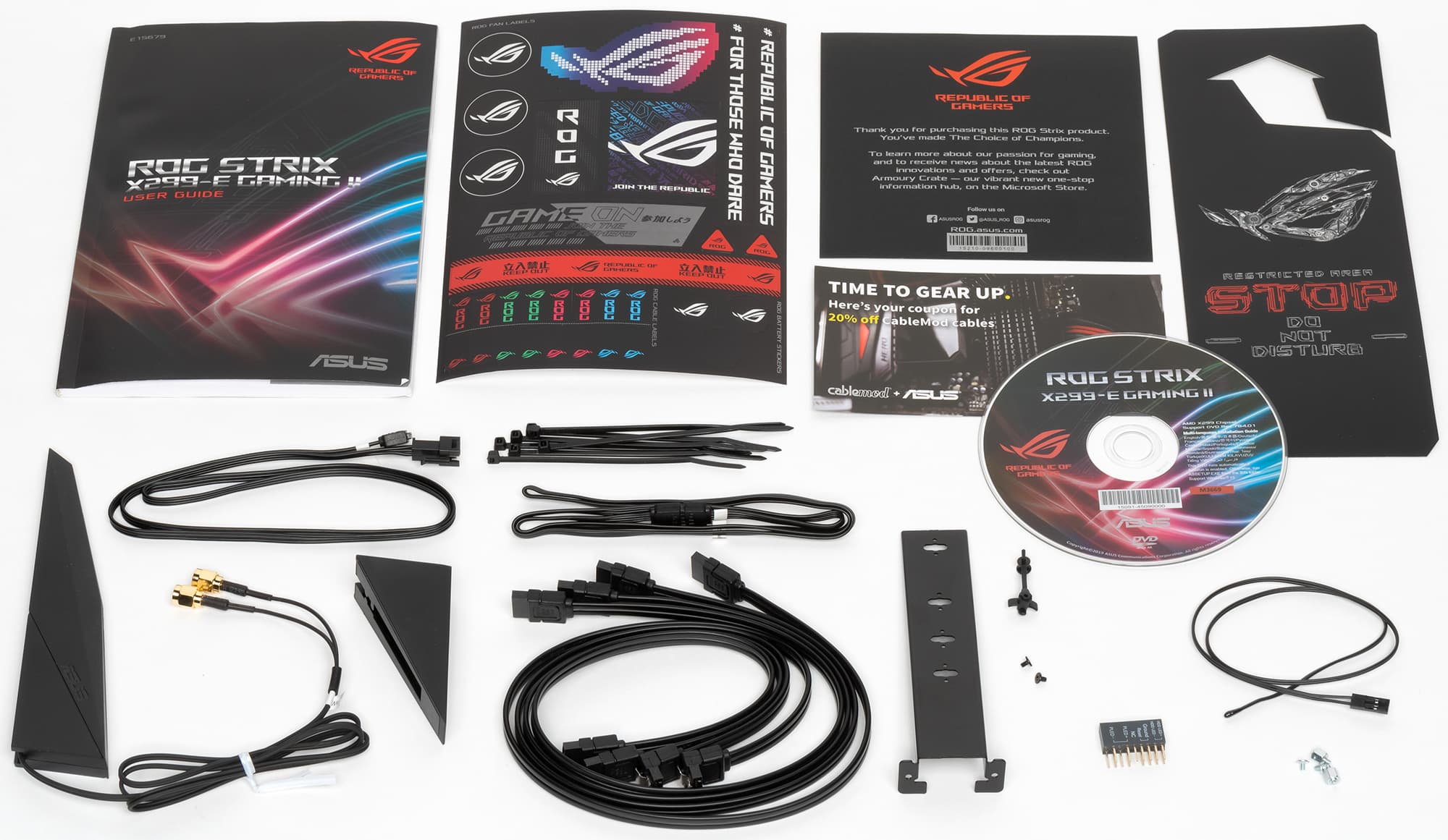 В комплекте поставки, кроме традиционных элементов типа руководства пользователя и кабелей SATA (что уже много лет является обязательным набором ко всем материнкам), есть выносная антенна с подставкой для беспроводных соединений, разветвители для подключения подсветок, винтики для монтажа модулей M.2, набор крепежа вертикального слота M.2, фирменный адаптер Q-Connector, провод с термодатчиком, накопитель типа CD, бонусные стикеры и наклейки.