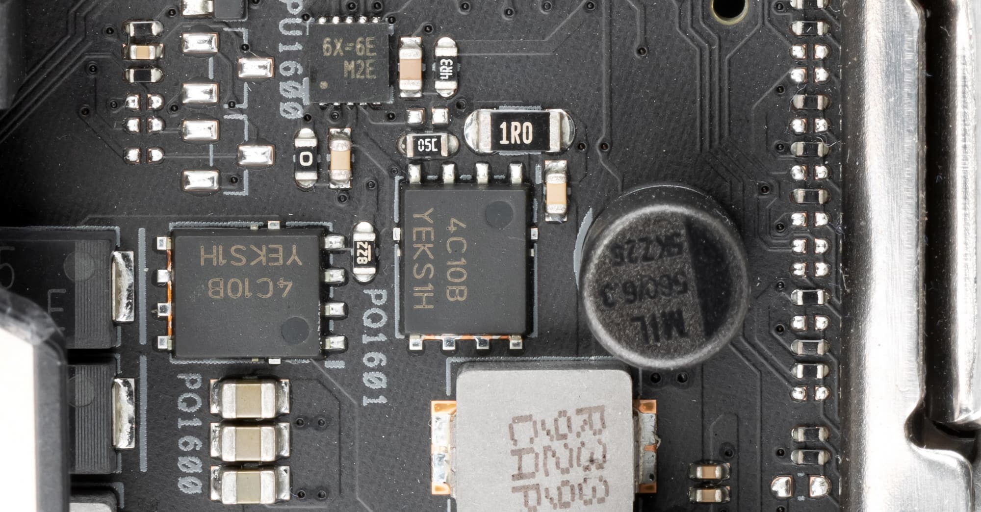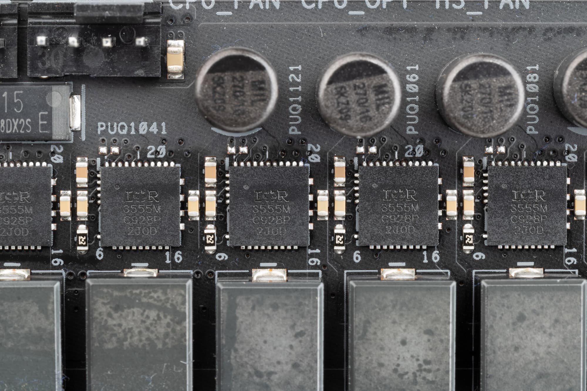 Каждый канал фазы имеет суперферритовую катушку и транзисторную сборку IR3555M на 60 A от International Rectifier (входит в состав Infineon).