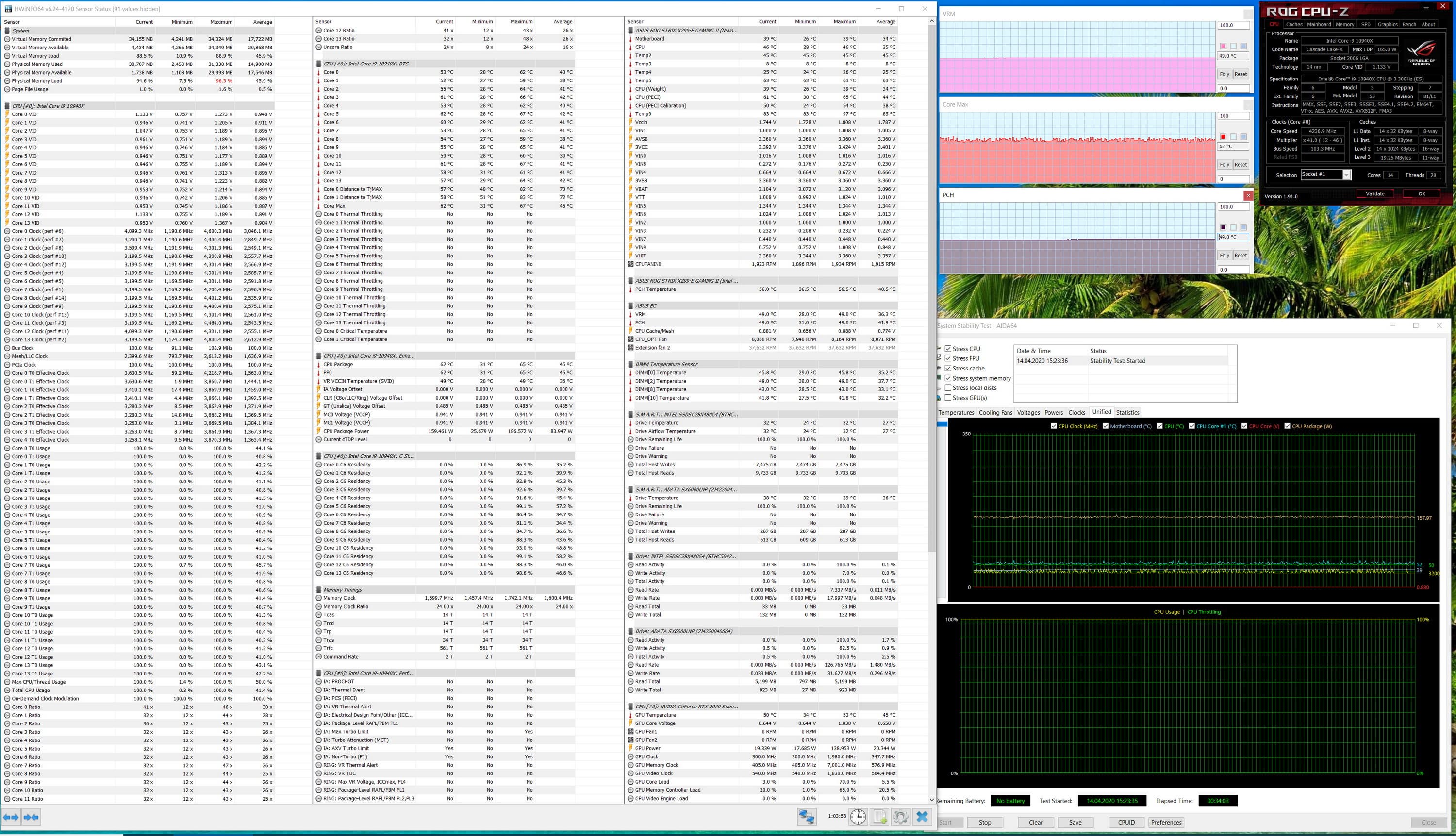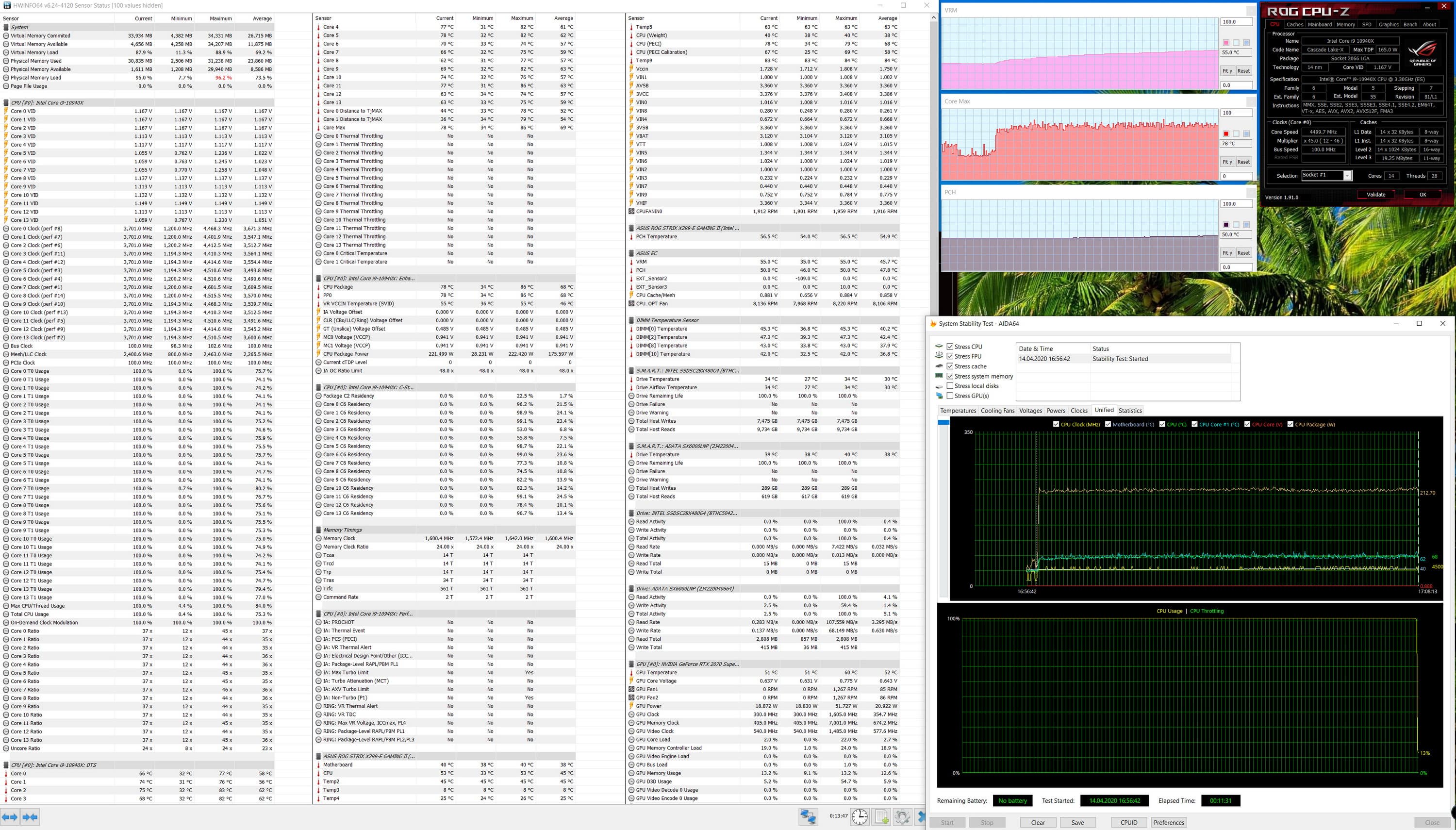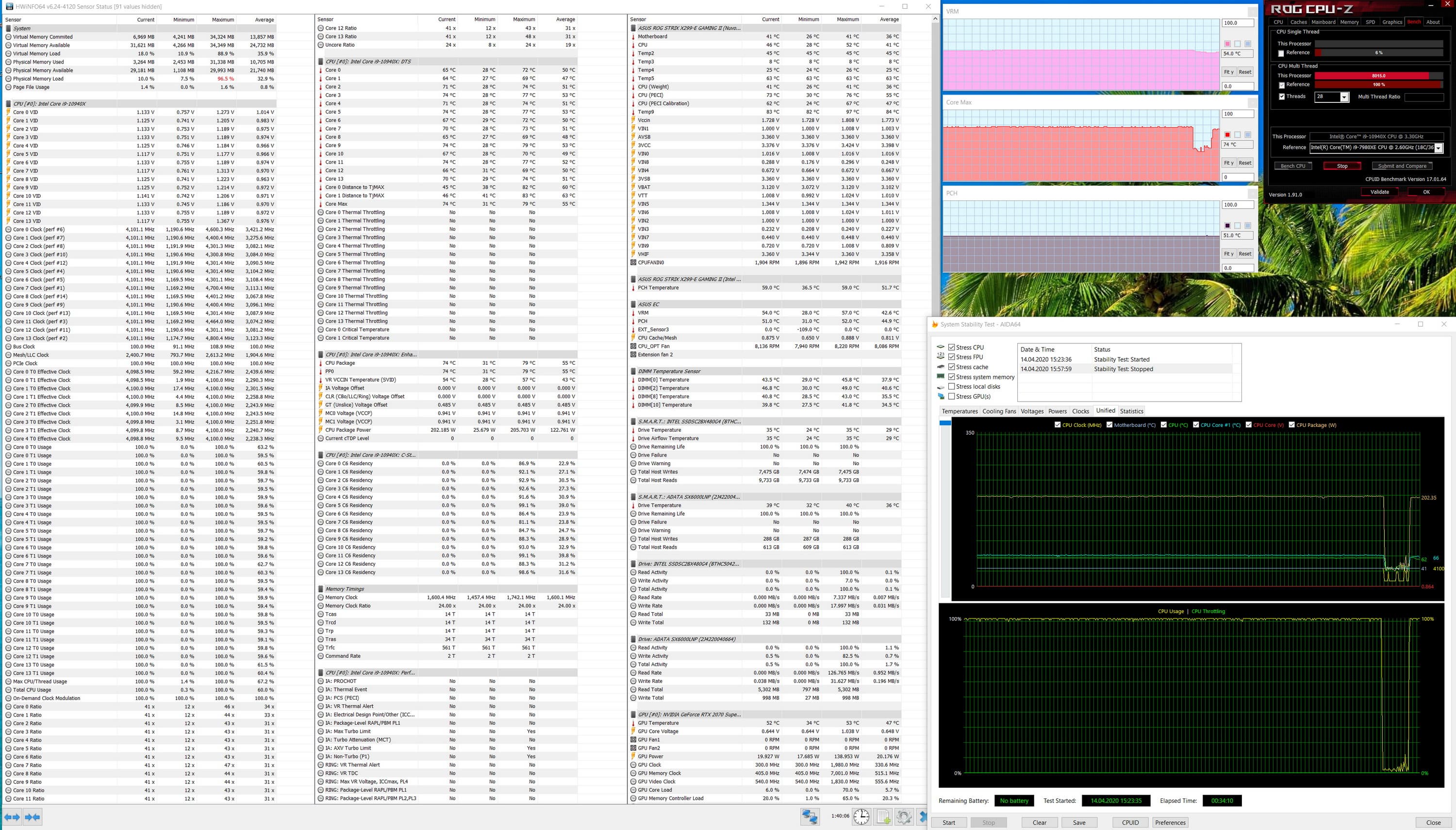 Нуууу... Да, конечно по сравнению с тем, что мы видели при работе по умолчанию, имеется явный прогресс: все ядра выставлены на 3,7 ГГц. При этом максимальный нагрев CPU также вырос до 86 °C (температуры VRM/X299 — те же, не выше 60 °C). Получил приросты производительности в тестах 3DMark — от 5 до 8%, PC Mark 10 — 9%, скорость рендеринга в Premiere выросла на 5%. Приятно конечно, однако все же это не те 4,1 ГГц, что ранее заставлял выставить бенчмарк в ROG CPU-Z. А ну-ка, запустим теперь этот бенчмарк...