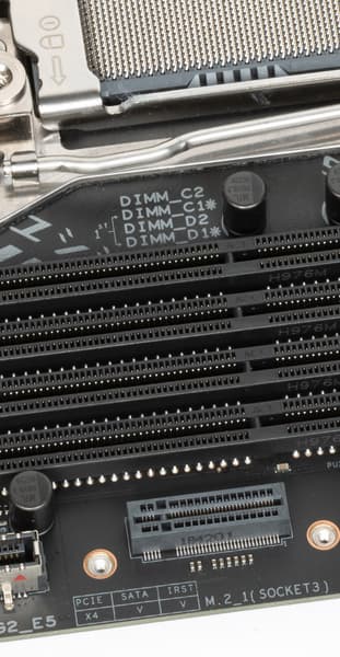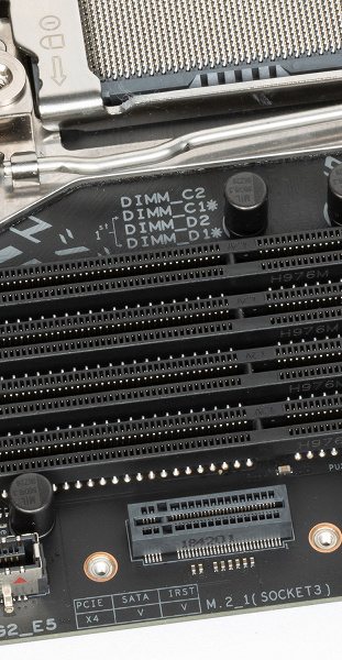 Еще одно гнездо M.2_1 имеет вертикальное расположение. Данный слот взаимодействует через Х299 и поддерживает накопители с любым интерфейсом.