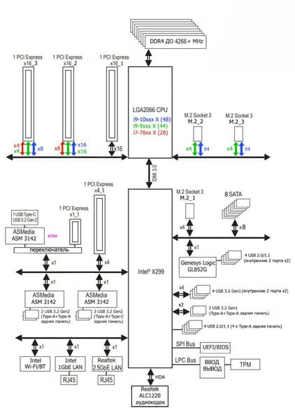 Процессоры Intel Core i9-7xxxX/9xxxX/10xxxX (совместимые с сокетом LGA2066 и поддерживаемые Х299) имеют 28 (Core 78xxX) или 44 (Core 79xxX/99xxX) или 48 (Core 10xxxX) линий ввода-вывода (включая PCIe 3.0), не имеют USB и SATA портов. При этом взаимодействие с X299 идет по особому каналу Digital Media Interface 3.0 (DMI 3.0), и линии PCIe на это не расходуются. Все PCIe линии процессора идут на слоты расширения PCIe (в отдельных случаях и на порты M.2).