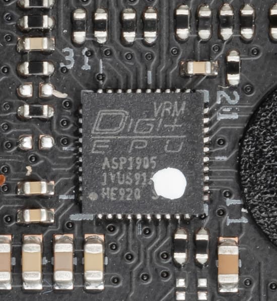 Но кто управляет фазами ядра? — Смотрим и видим цифровой контроллер Digi+ EPU ASP1905 (к сожалению, найти информацию по нему не удалось). Удвоителей фаз на плате нет, поэтому сразу приходит мысль о традиционной уже для Asus схеме программного управления фазами.