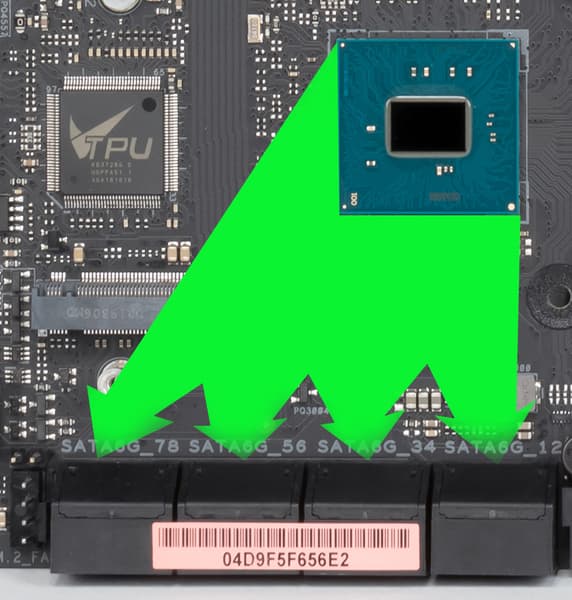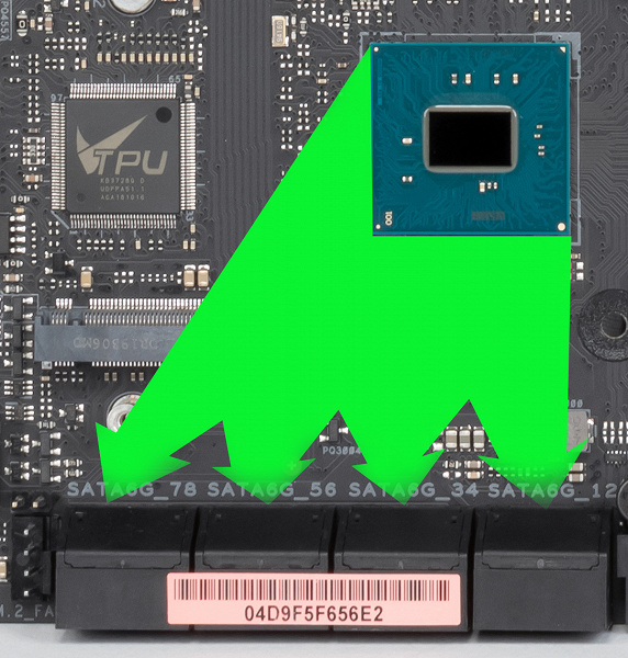 Всего у платы 8 разъемов Serial ATA 6 Гбит/с + 3 слота для накопителей в форм-факторе M.2. (Еще один слот M.2, спрятанный под кожухом блока разъемов задней панели, занят контроллером беспроводных сетей Wi-Fi/Bluetooth.). Все порты SATA реализованы через чипсет X299.