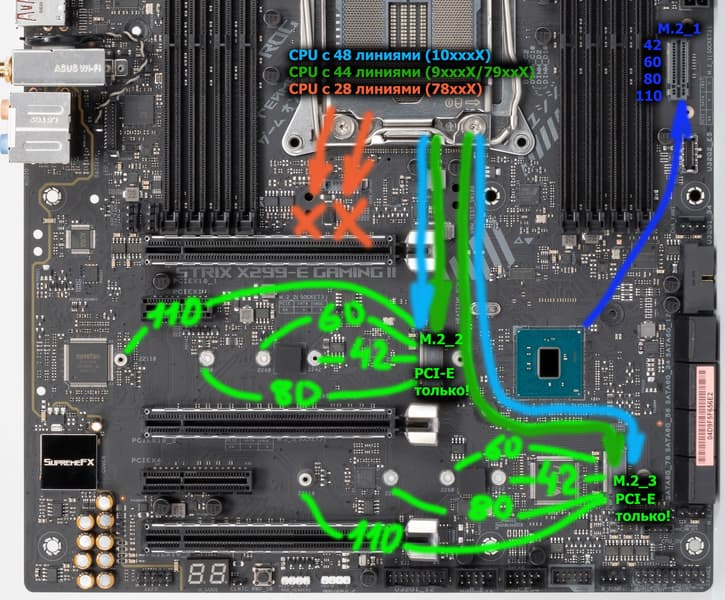 - Переключатель: если CPU с 48 или 44 линиями PCIe, слоты M.2_2 и M.2_3 (только PCIe накопители!) получают 4+4 линии, если CPU с 28 линиями PCIe, то M.2_2 и M.2_3 отключены (i9-10xxxX +4=48, i9/i7-9xxxX/79xxX +4=44, i7-78xxX +0=28);