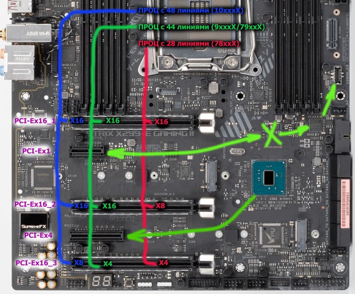 На плате есть 5 слотов: три PCIe x16 (для видеокарт или других устройств) и два «коротких» PCIe x4 и PCIe x1. У процессора есть 28/44/48 линий PCIe 3.0, они все идут на PCIe x16 слоты, остальные два «снабжает» чипсет X299. Вот так выглядит схема распределения: