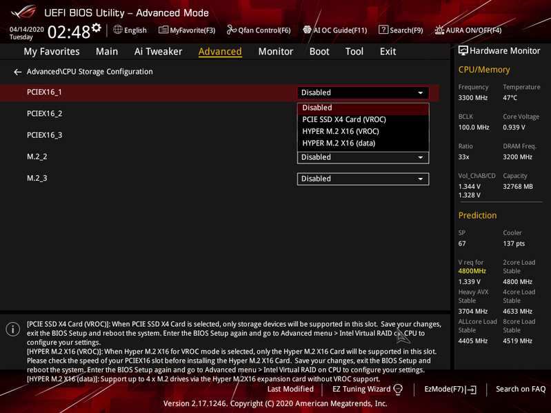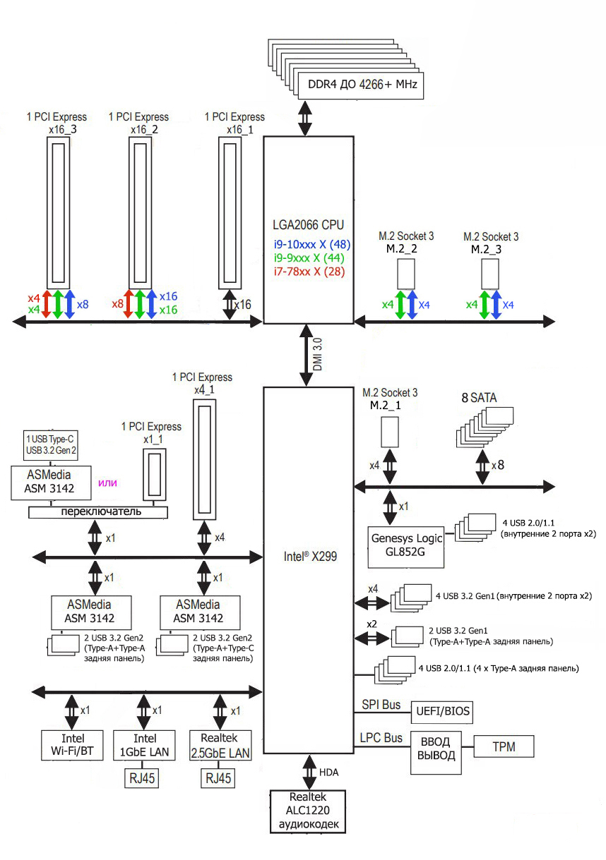 - Переключатель: если CPU с 48 или 44 линиями PCIe, то слот PCIe x16_2 получает 16 линий; в противном случае (CPU с 28 линиями PCIe) — 8 линий (i9-10xxxX +16=32, i9/i7-9xxxX/79xxX +16=32, i7-78xxX +8=24);