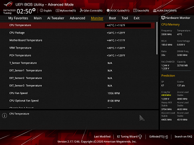 Система питания имеет 13 фаз (2×6+1) для ядра и 2×1 для памяти, она способна обеспечить работу любых совместимых процессоров под хорошим авторазгоном (при слабом конвертере питания HEDT-процессоры не только не поднимали бы частоты выше номинала, но и вряд ли дотягивали бы даже до него). Плата имеет отменное охлаждение, которое предусматривает массивные радиаторы на силовых элементах системы питания и на чипсете, 8 разъемов для вентиляторов и помп, радиаторы для всех накопителей в горизонтально расположенных слотах M.2.