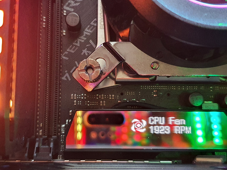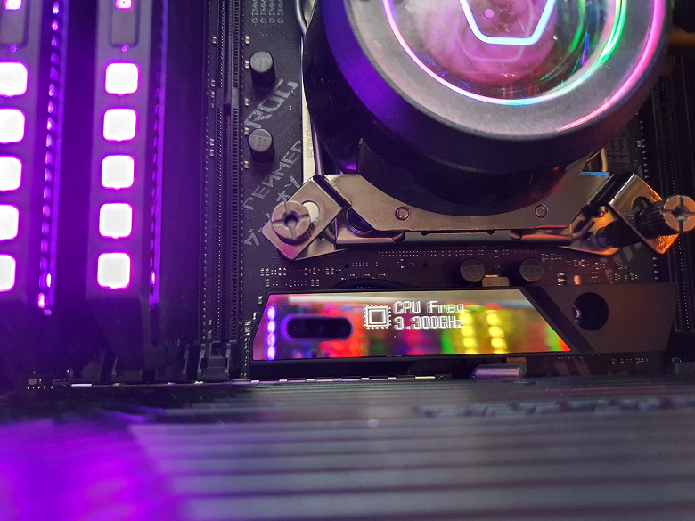 Армирование слотов PCIe также является плюсом. Еще в плюсы надо добавить красивую подсветку самой платы (включая широкие возможности для подключения дополнительных RGB-устройств) и наличие маленького экранчика, который может демонстрировать текущие параметры работы (он будет актуален при размещении платы в корпусе с окошком, стоящем на столе).