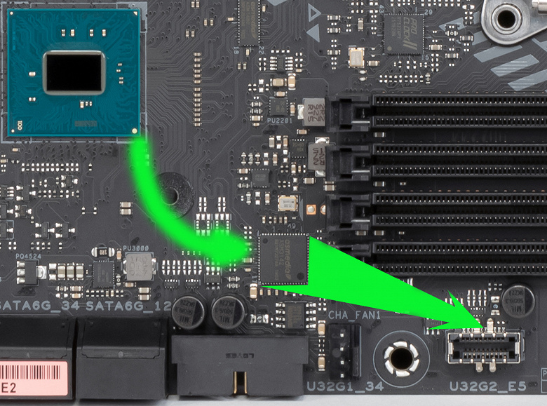 - Переключатель: или ASMedia ASM3142 (1 USB 3.2 Gen2 на внутреннем разъеме Type-C), или слот PCIe x1_1: (1 линия);