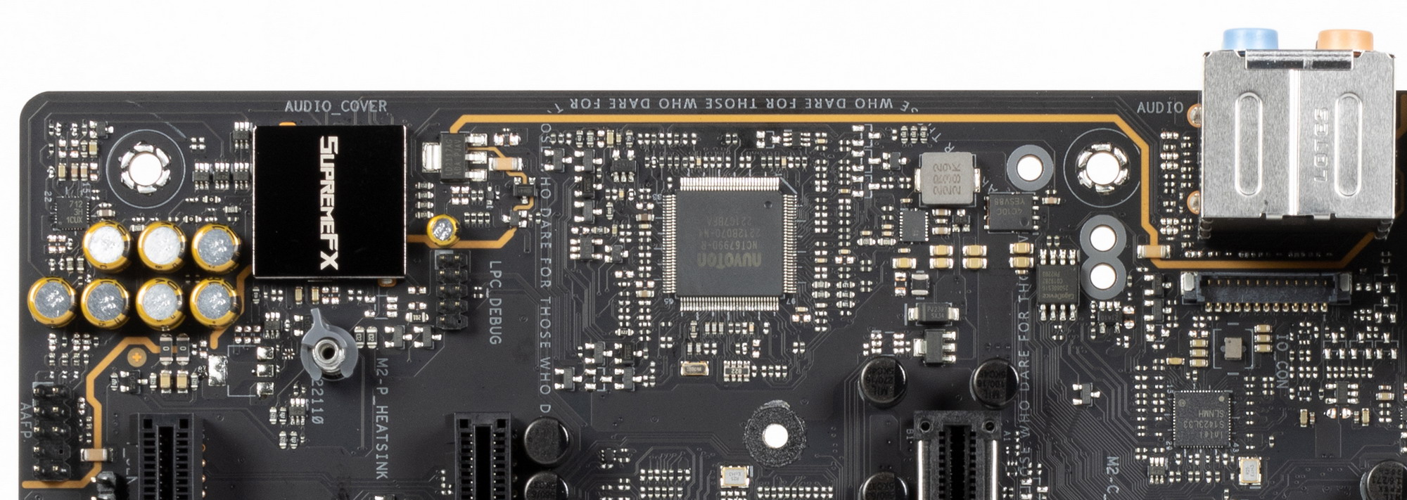 Аудиотракт вынесен на угловую часть платы, не пересекается с другими элементами. Все аудиоразъемы на задней панели имеют позолоченное покрытие, а также привычную цветовую окраску.