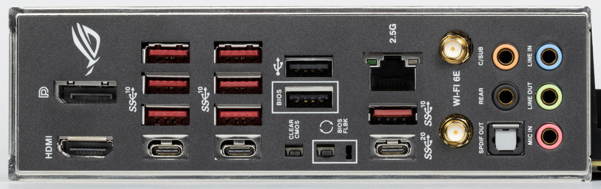 | Разъемы на задней панели | 2 × USB 3.2 Gen2 (Type-C) 7 × USB 3.2 Gen2 (Type-A) 1 × USB 3.2 Gen2x2 (Type-C) 1 × RJ-45 5 аудиоразъемов типа миниджек 1 × S/PDIF (оптический, выход) 1 × HDMI 2.1 1 × DP 1.4a 2 антенных разъема кнопка сброса CMOS кнопка перепрошивки BIOS — Flashback |