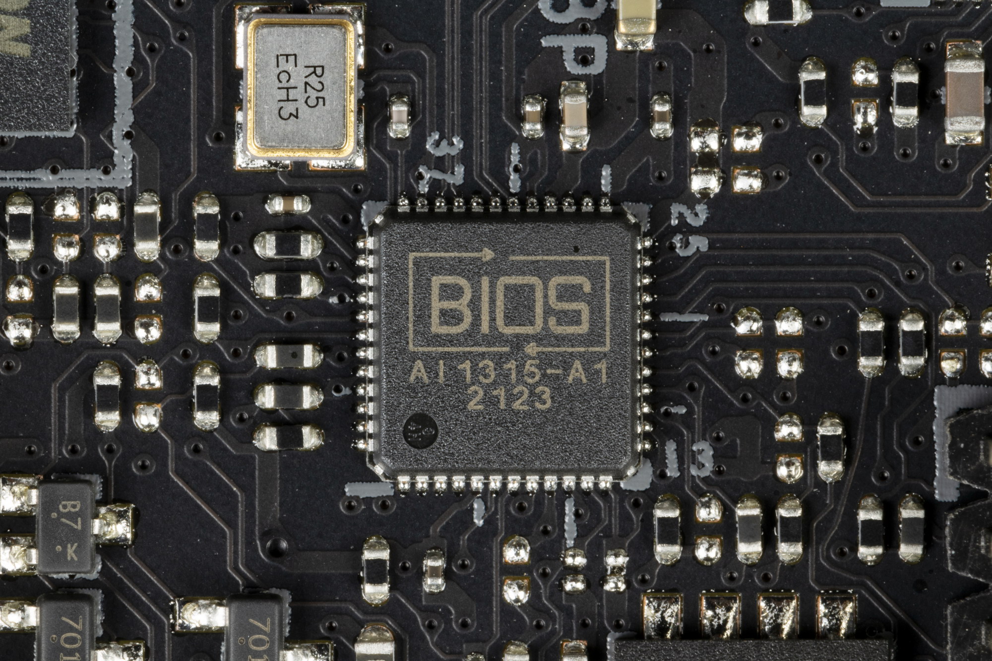 На оборотной стороне расположено несколько контроллеров. Текстолит обработан хорошо: во всех точках пайки не только острые концы срезаны, но и все неплохо отшлифовано. Защитной пластины (бэкплейта) нет. Интересно отметить, что дизайнеры постарались тыльную сторону матплаты украсить фирменным рисунком серии ROG Strix. Жаль, что это творение на мгновение лишь увидит сборщик ПК, в который данную плату установят.