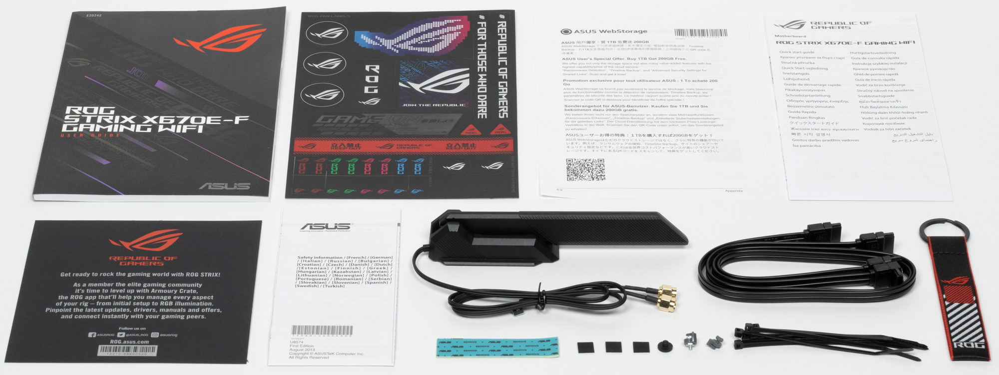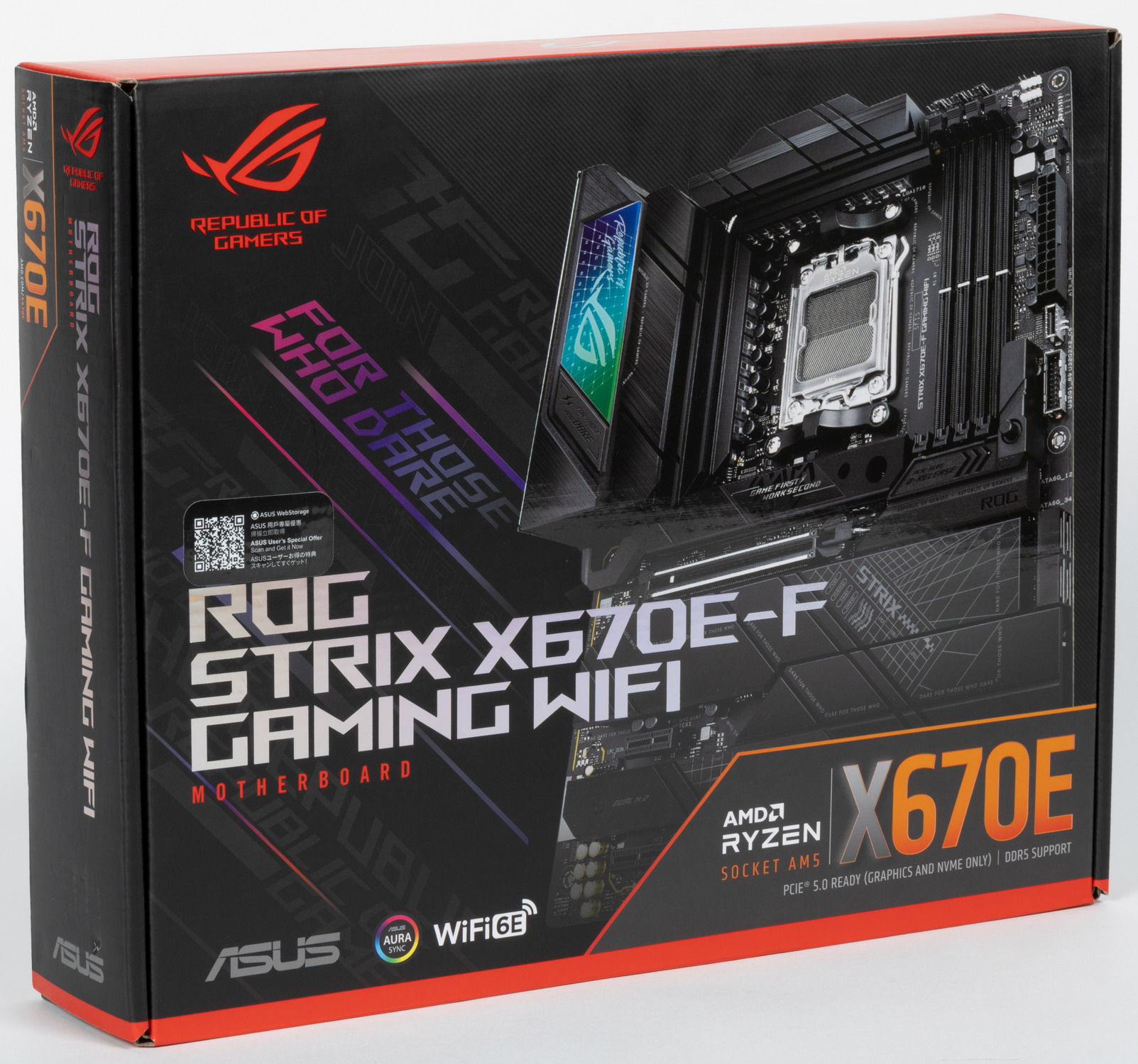 Asus ROG Strix X670E-F Gaming WiFi поставляется в традиционной коробке фирменного дизайна серии ROG. Комплект размещен под платой в отдельном отсеке.