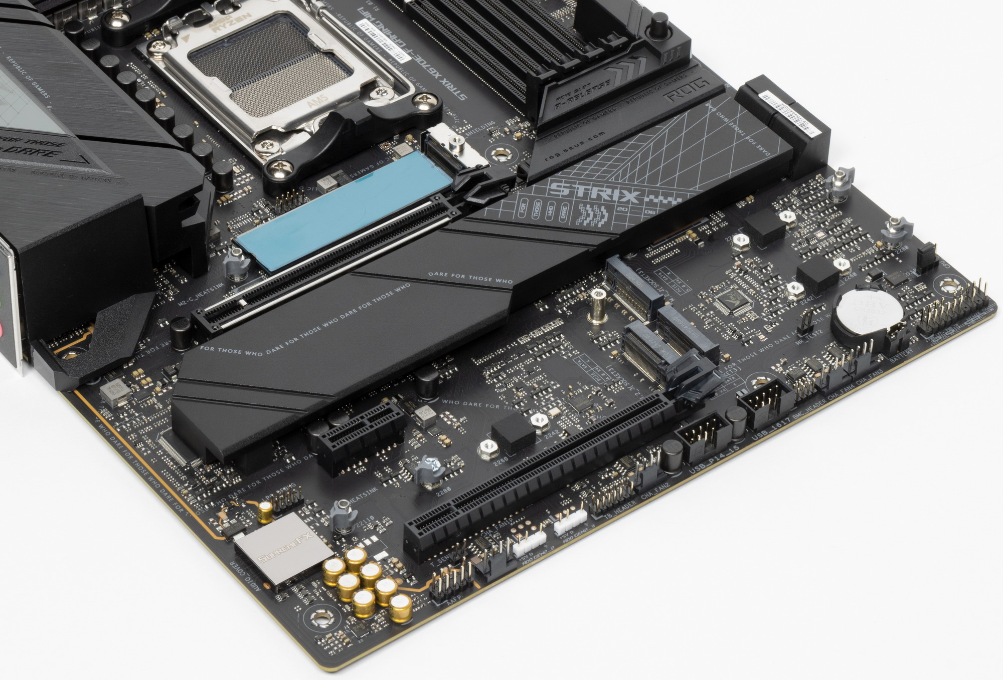 Всего на плате есть 3 слота: два PCIe x16 и один PCIe x1. Если про первый PCIe x16_1 я выше уже рассказал (он подключен к CPU), то PCIe x1 подключен к X670E линиями PCIe 3.0, а PCIe x16_2 по факту имеет поддержку всего 4х линий PCIe 4.0 и также подключен к X670E.