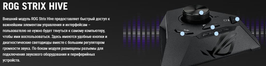 | Разъемы на ROG Strix Hive | 1 × USB 3.2 Gen2 (Type-C) 1 × USB 2.0 (Type-A) 1 аудиоразъем типа миниджек (для наушников и микрофона) 1 аудиоразъем типа миниджек (S/PDIF (оптический, выход) и микрофон, вход) кнопка FlexKey (перезагрузка, загрузка в безопасном режиме, выключение подсветки) кнопка включения и выключения AMD Precision Boost Overdrive регулятор громкости звука кнопка перепрошивки BIOS — Flashback |