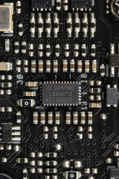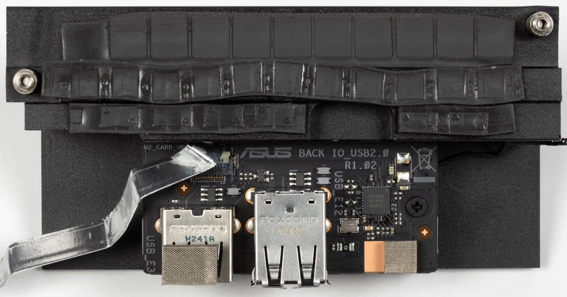 - 7 портов USB 2.0/1.1: четыре реализованы через X670E и представлены: 1 на внешнем блоке Asus ROG Hive портом Type-A; 3 – двумя внутренними разъемами (каждый на 2 порта) на вспомогательной плате ROG FPS-II; остальные три реализованы через хаб Genesys Logic GL850G (на него потрачена 1 линия USB 2.0 от CPU) и представлены на задней панели тремя портами Type-A (черного цвета).