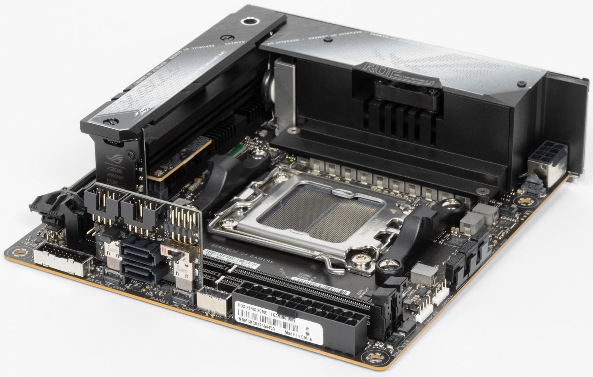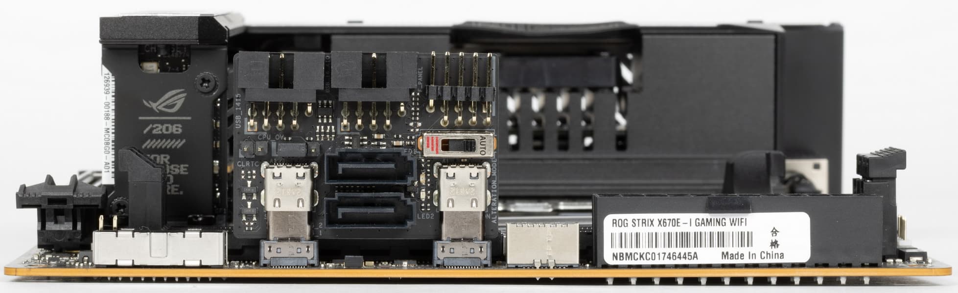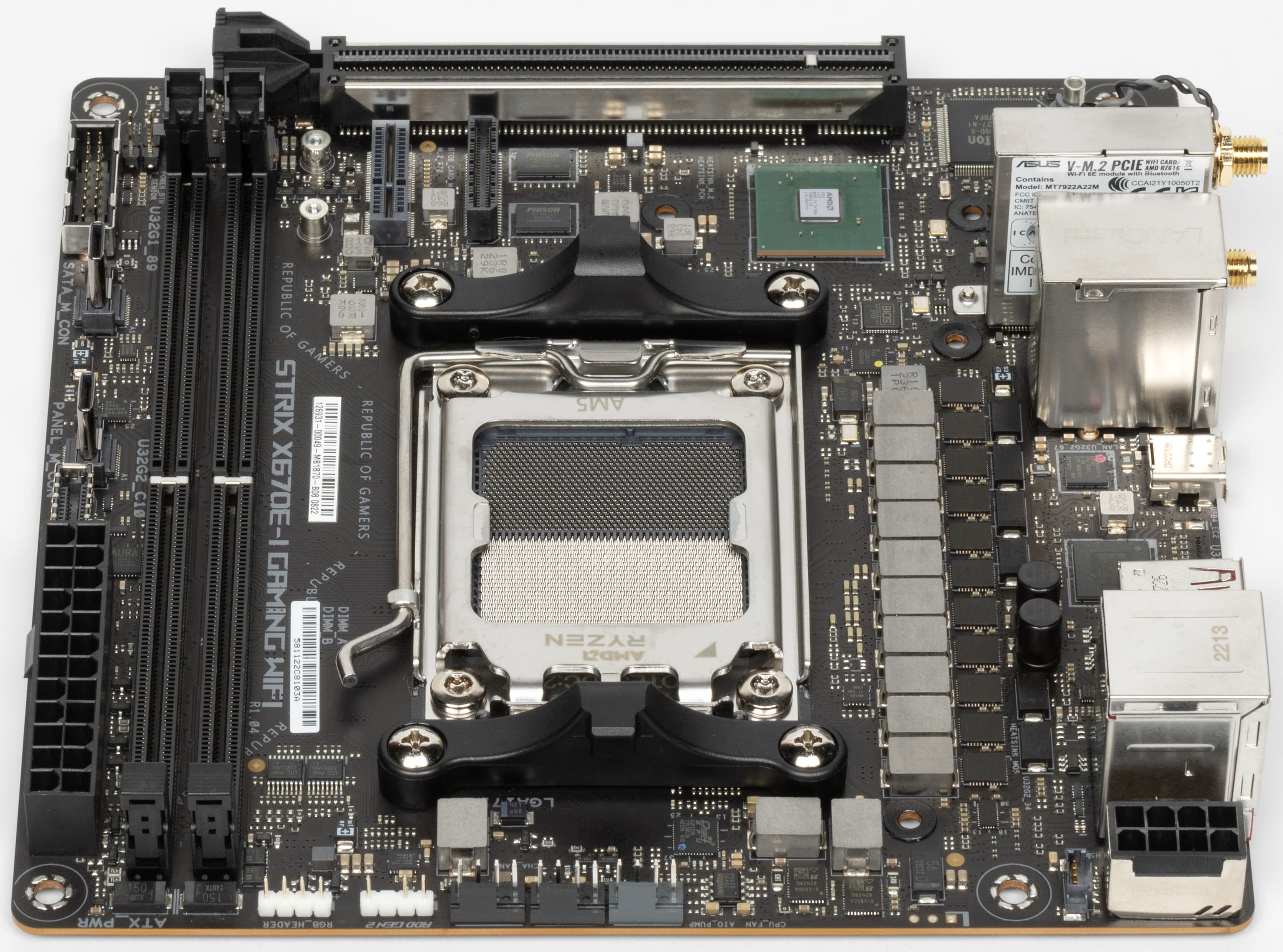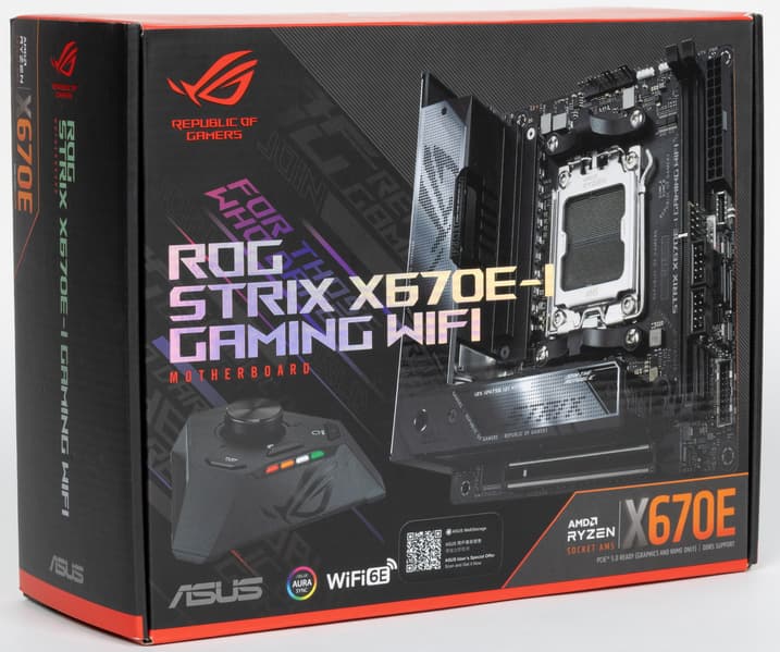 Переходим к самой материнской плате Asus ROG Strix X670E-I Gaming WiFi, которая относится к топовому суббренду ROG, поэтому перед нами топовый продукт, однако все же не флагманский (мы помним, что самые-самые в ROG – материнки c суффиксом ROG Crosshair, а не ROG Strix).