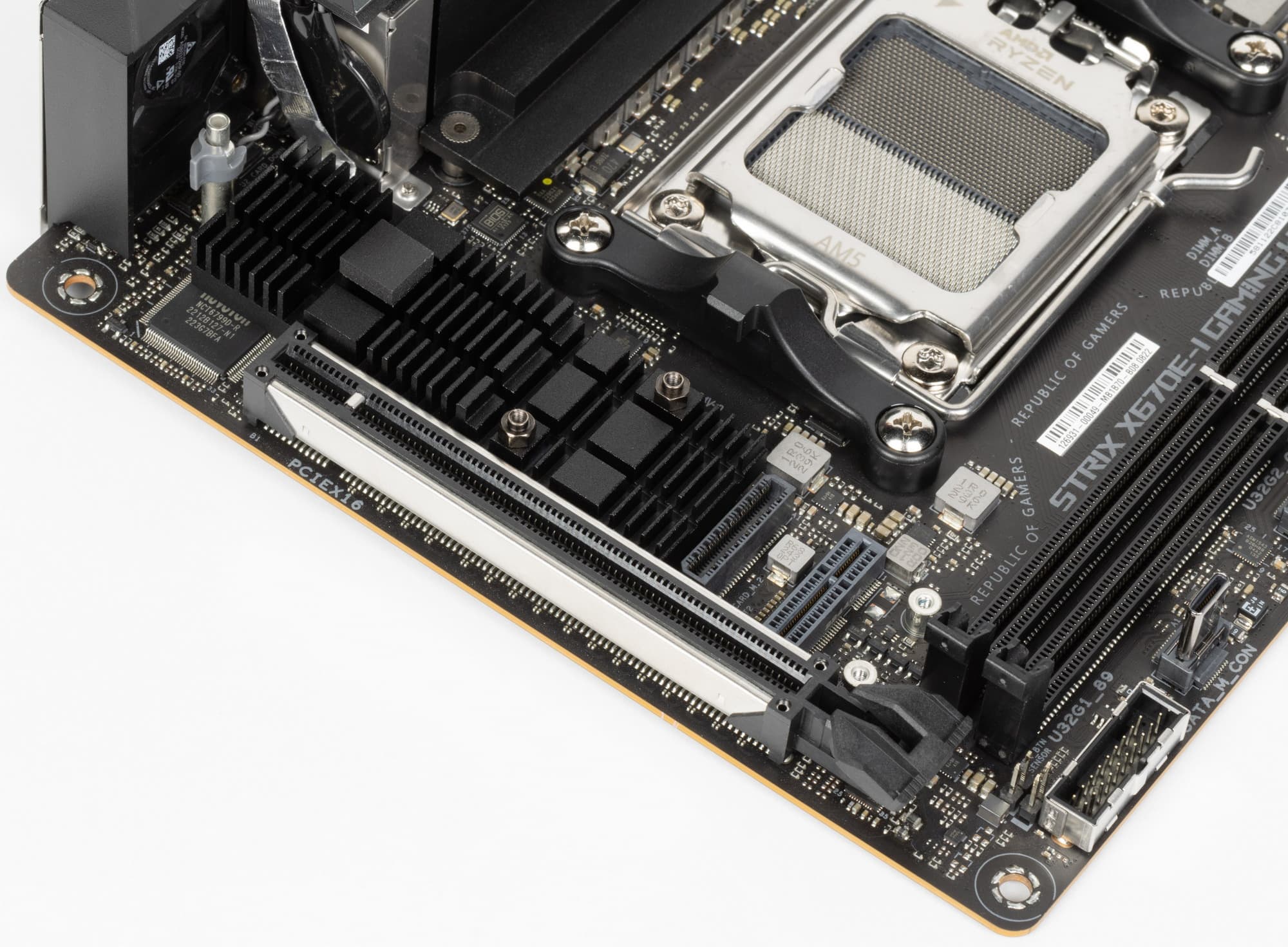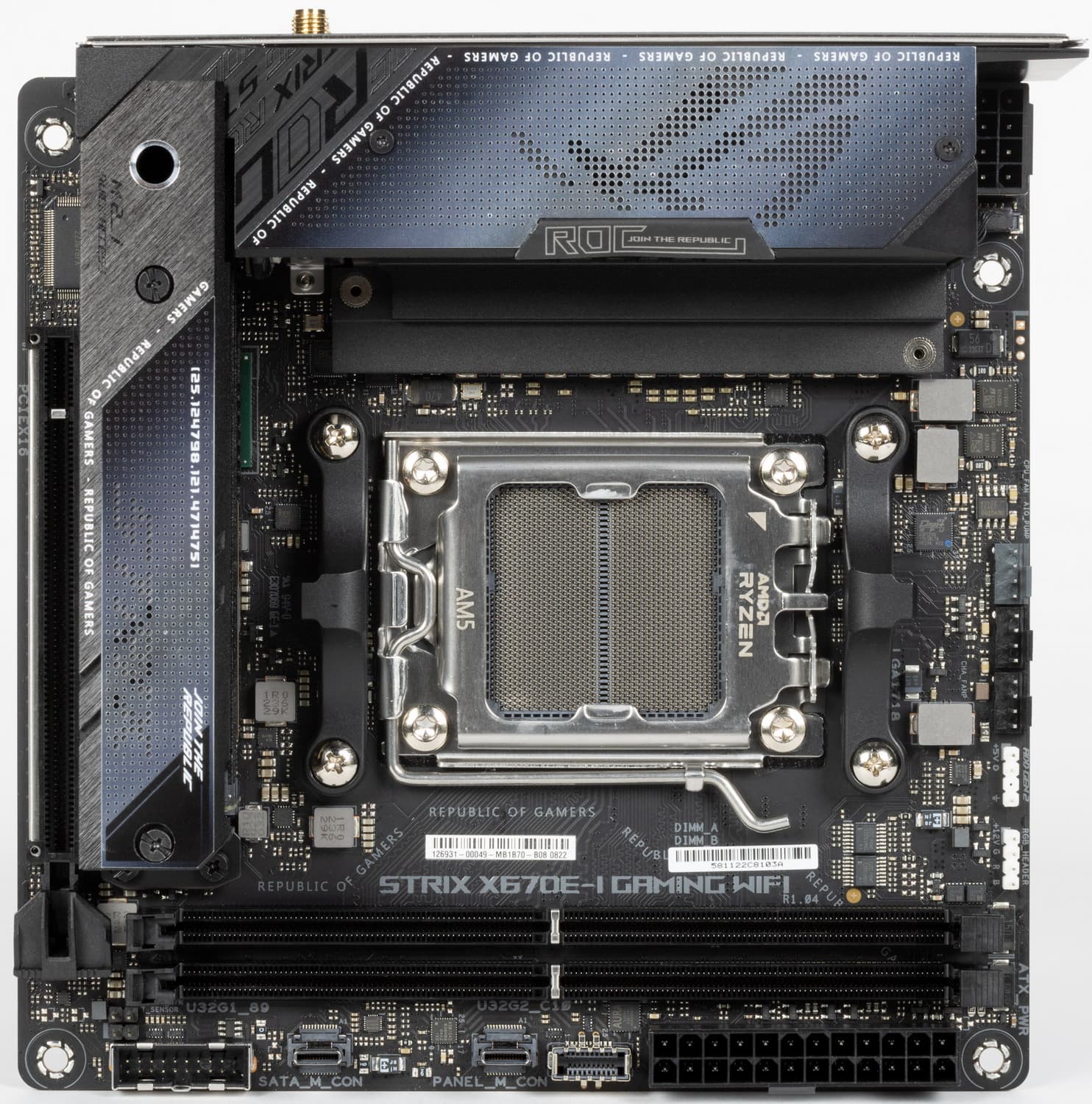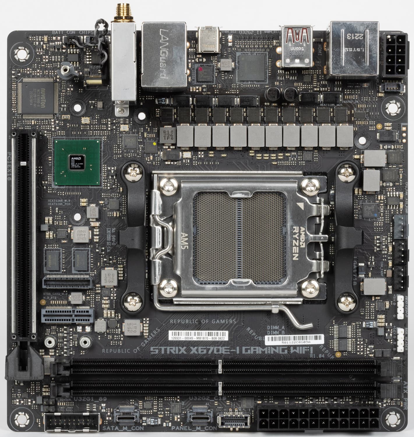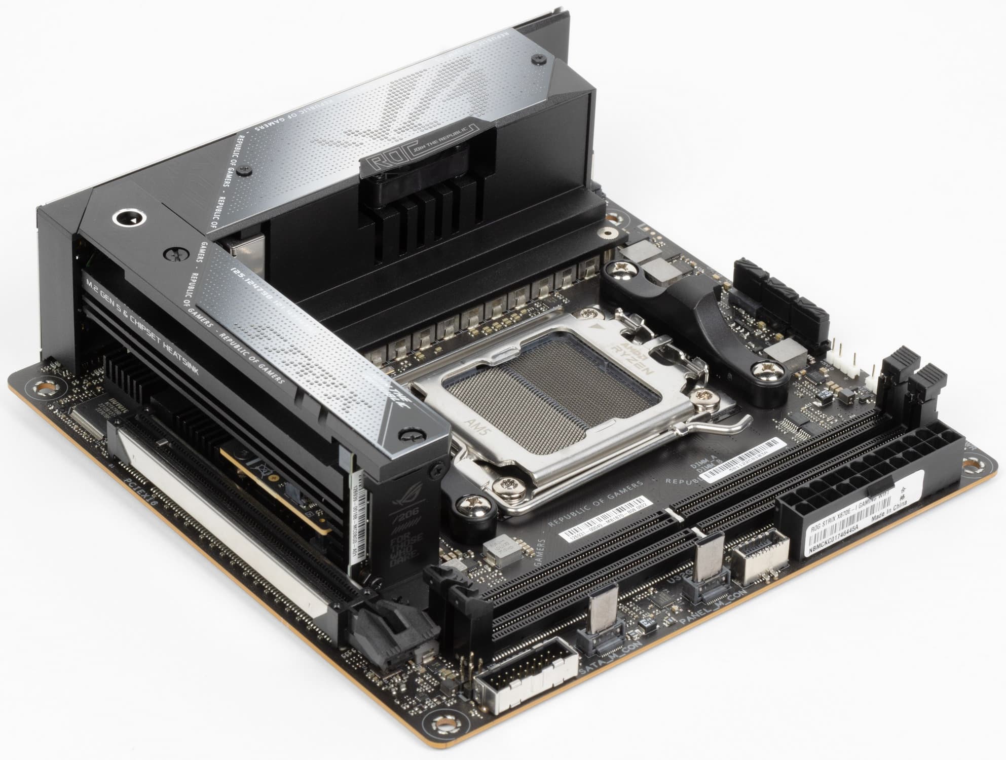 Переходим к самой материнской плате Asus ROG Strix X670E-I Gaming WiFi, которая относится к топовому суббренду ROG, поэтому перед нами топовый продукт, однако все же не флагманский (мы помним, что самые-самые в ROG – материнки c суффиксом ROG Crosshair, а не ROG Strix).