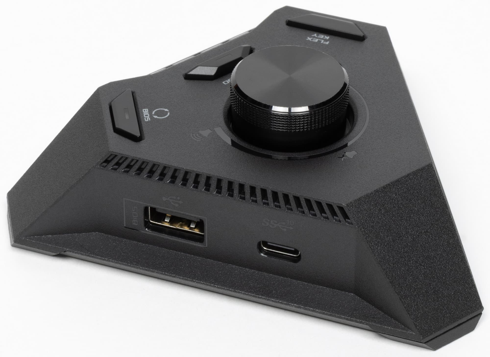 Внешний блок Hive представляет собой этакую урезанную треугольную пирамиду, в нем сосредоточена вся аудиоподсистема с гнездами выводов и управлением громкости звука, имеется пара USB-портов, кнопка для обновления прошивки BIOS в «холодном» режиме, индикаторы текущих инициализаций материнки при ее включении.