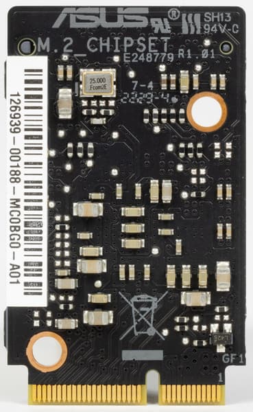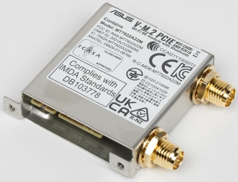 Имеется и комплексный беспроводной адаптер на контроллере Mediatek MT7922, через который реализованы Wi-Fi 6E (802.11a/b/g/n/ac/ax) и Bluetooth 5.3. Он установлен в слот M.2 (E-key), и его разъемы для привинчивания выносных антенн выведены на заднюю панель.