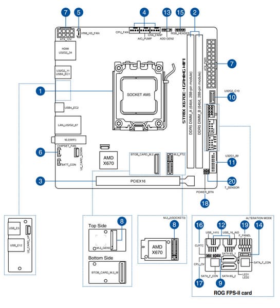| Прочие внутренние элементы на ROG FPS-II | 2 разъема для подключения 3 портов USB 2.0 2 порта SATA 1 переключатель Alt_mode 1 разъем для термодатчика 1 разъем сброса CMOS 1 разъем для подключения управления с передней панели корпуса 1 переключатель CPU_OV |