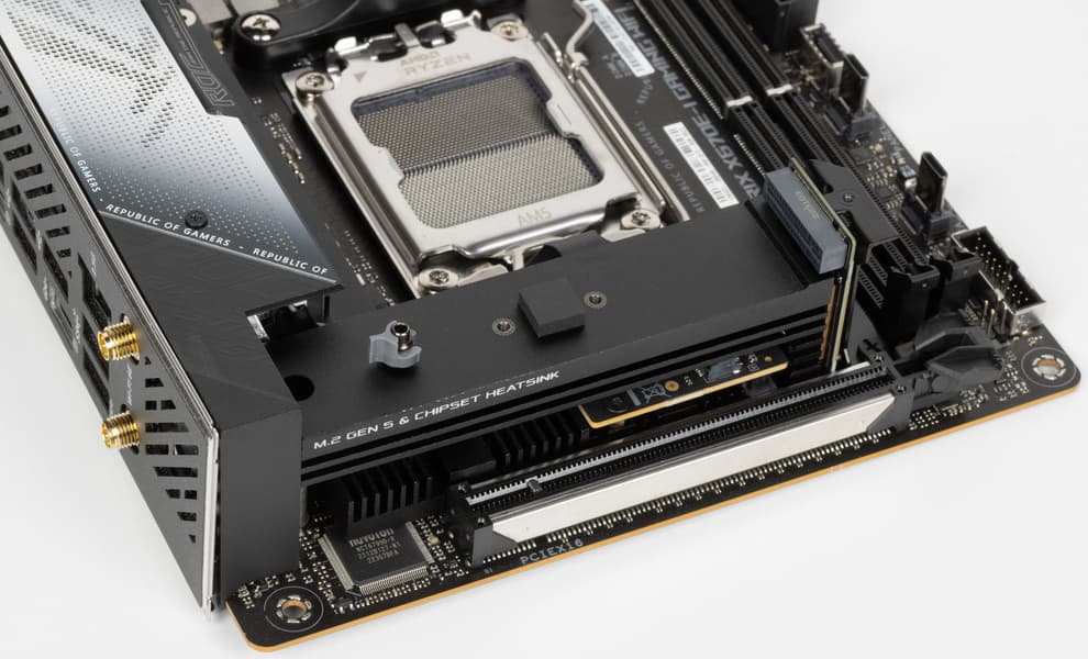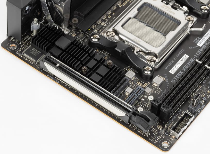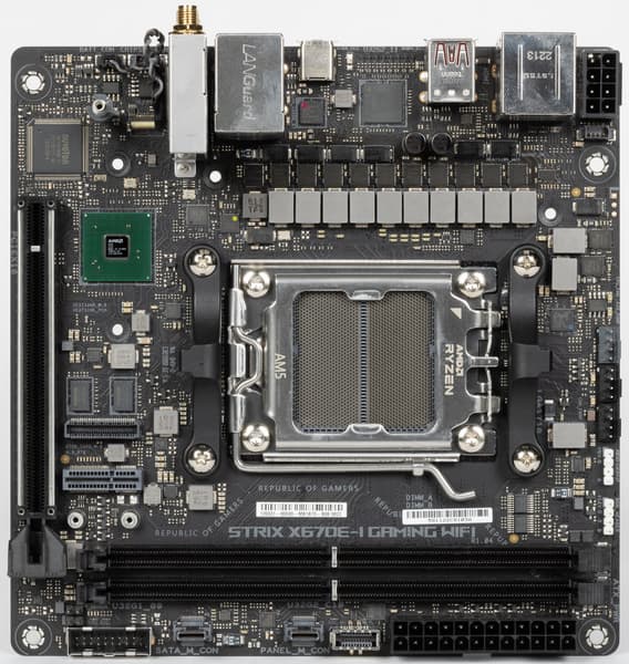 У Asus ROG Strix X670E-I Gaming WiFi имеется 18 портов USB разных видов, включая 7 очень быстрых USB 3.2 Gen2, и 2 порта USB4/Thunderbolt 4 (со скоростью передачи данных до 40 Гбит/с). Плата предлагает 1 слот PCIe х16, который получает от процессора 16 линий PCIe 5.0. Также у нее 2 слота M.2: один из них подключен напрямую к процессору линиями PCIe 5.0, другой подключен к чипсету X670E линиями PCIe 4.0. В арсенале платы также есть 2 порта SATA и 3 разъема для вентиляторов. Система питания процессора весьма мощная, она способна обеспечить работу любых совместимых процессоров с приличным запасом на разгон. Плата имеет грамотную систему охлаждения каждого потенциально греющегося элемента, включая накопители в слотах M.2. Сетевые возможности включают проводной контроллер 2,5 Гбит/с и беспроводной Wi-Fi 6E + Bluetooth 5.3. В числе плюсов платы можно упомянуть возможности для подключения дополнительных RGB-устройств. Отметим и улучшенный аудиокодек Realtek ALC4050.