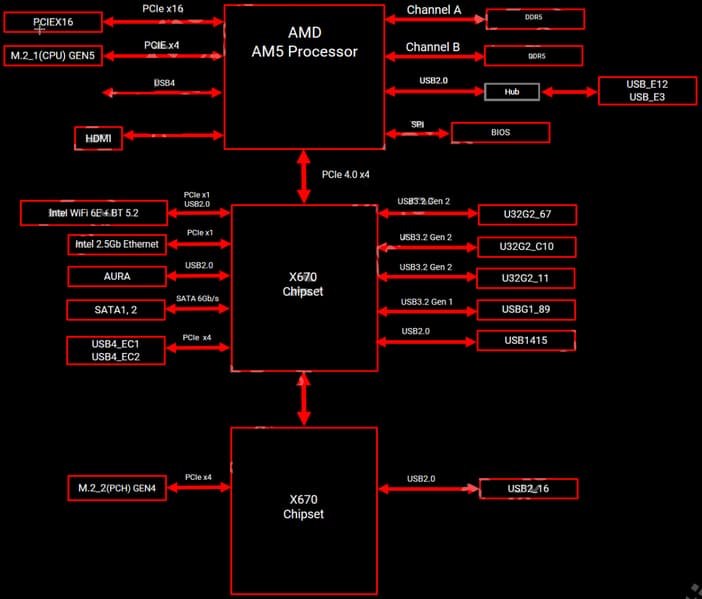 Плюс 12 линий PCIe, выделенные на поддержку иной периферии. Итого, у X670E в данном случае реализован 21 высокоскоростной порт.