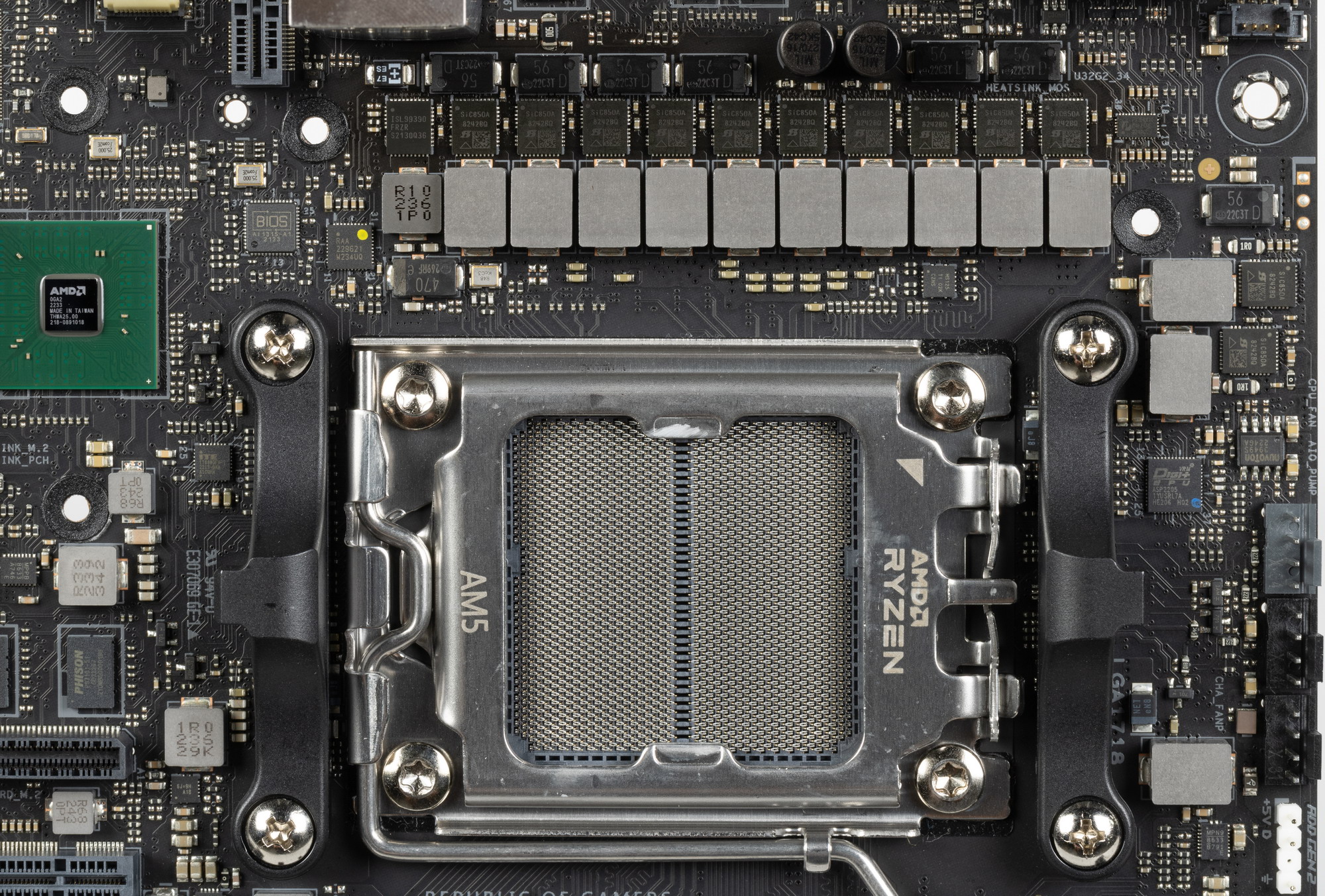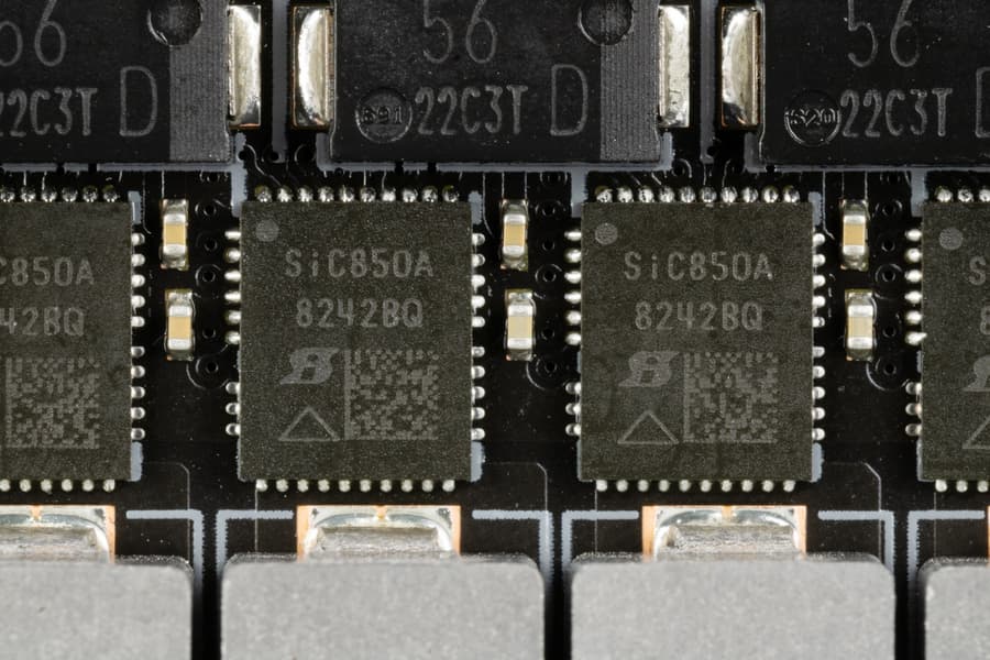 Каждый канал фазы VCore и SoC имеет суперферритовый дроссель и транзисторную сборку SiC850A от Vishay (до 110A).