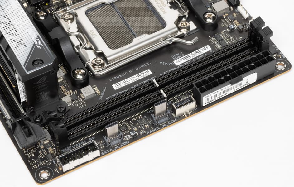 Форм-фактор Mini-ITX имеет размеры 170x170 мм, Micro-ATX до 244×244 мм, ATX до 305×244 мм, а E-ATX — до 305×330 мм. Материнская плата Asus ROG Strix X670E-I Gaming WiFi имеет размеры 170×170 мм, поэтому выполнена в форм-факторе Mini-ITX, и на ней имеются 4 монтажных отверстия для установки в корпус.