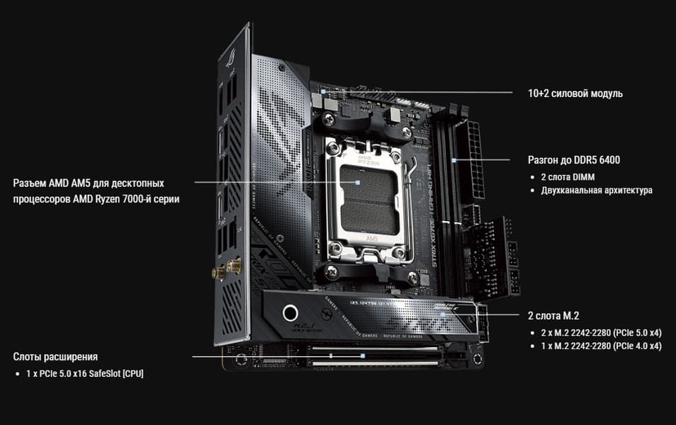 Материнская плата Asus ROG Strix X670E-I Gaming WiFi — интересный представитель топовой серии ROG с примерной стоимостью в районе 50 тысяч рублей на момент публикации обзора. Это миниатюрная модель форм-фактора Mini-ITX, предназначенная для компактных ПК, но при этом весьма навороченная плата с поддержкой процессоров AMD Ryzen 7000/8000/9000, созданная для геймеров и энтузиастов-оверклокеров. Стоимость оправдана как весьма достойной поддержкой периферии, так и комплектом поставки.