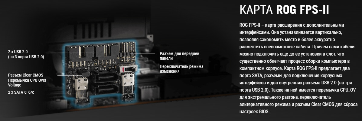 Вспомогательная карта ROG FPS-II (карта расширения) также предназначена для расширения возможностей матплаты в виду ее малых размеров согласно форм-фактора Mini-ITX.