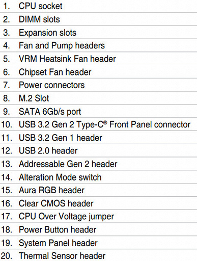 | Прочие внутренние элементы на материнской плате | 24-контактный разъем питания ATX 1 8-контактный разъем питания EPS12V 1 слот M.2 (E-key), занят адаптером беспроводных сетей 1 разъем для подключения порта USB 3.2 Gen2 Type-C 1 разъем для подключения 2 портов USB 3.2 Gen1 3 разъема для подключения 4-контактных вентиляторов и помп ЖСО 1 разъем для подключения неадресуемой RGB-ленты 1 разъем для подключения адресуемой ARGB-ленты 1 переключатель версии PCIe 1 разъем для термодатчика 1 кнопка включения питания Power |