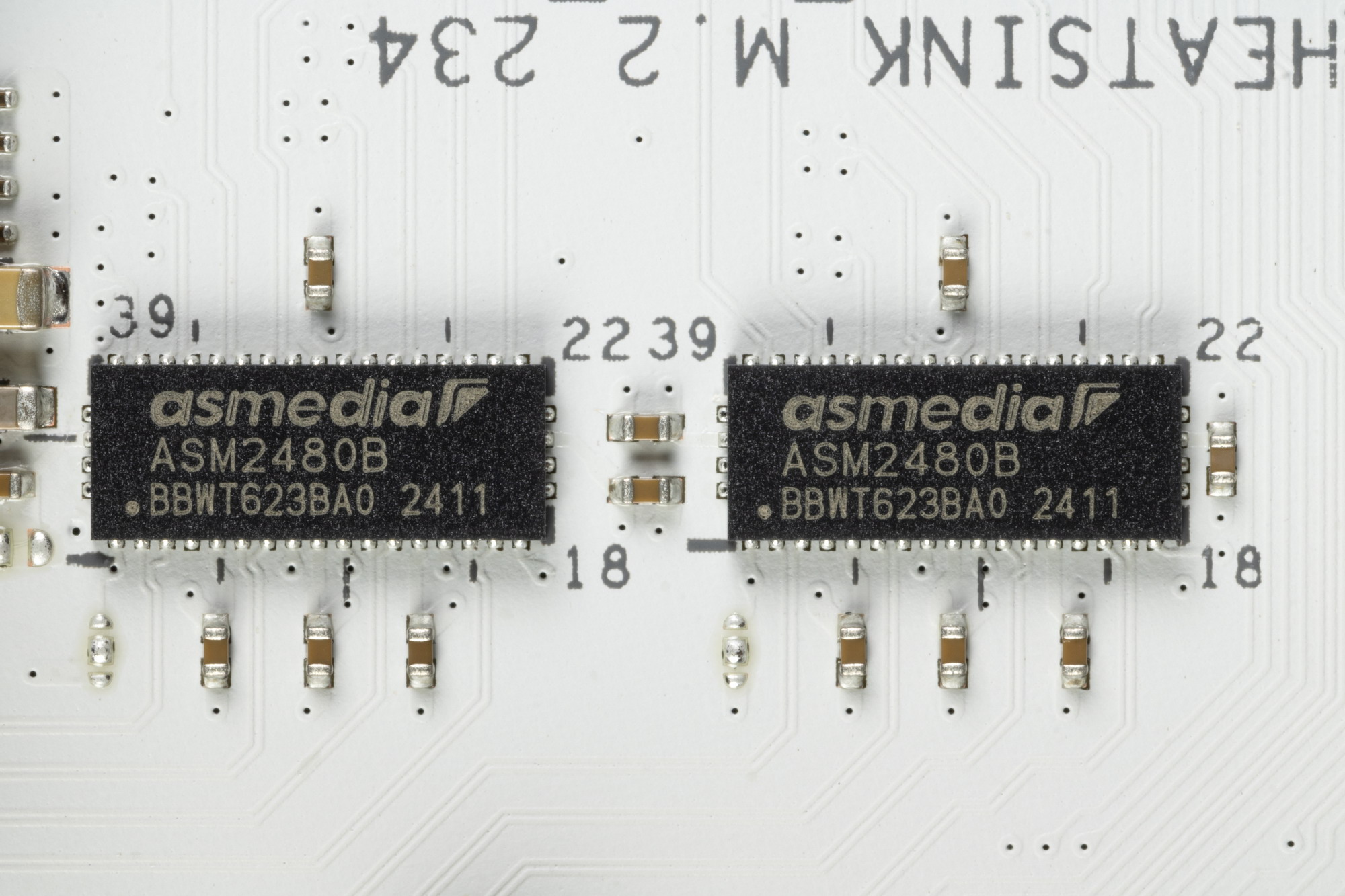 Но это еще не все: если посмотреть на схему распределения слотов выше, то можно увидеть еще одно условие работы портов/слотов: M.2_3 делит ресурсы со слотом PCIe x16_2, и тут для автоматического переключения ресурсов востребованы мультиплексоры ASM2480 от ASMedia.